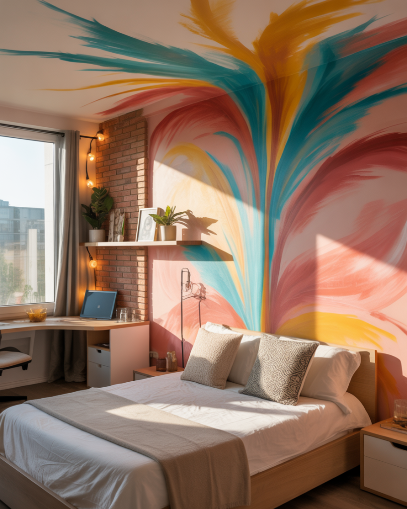 When floor space is scarce, use walls for expression. In a 500 sq ft studio, a hand-painted mural or wallpaper adds character without stealing inches. I once saw a vintage-inspired floral mural behind a boho bed—it transformed the entire room. Art as architecture is a 2026 trend that personalizes even the tiniest aesthetic space.