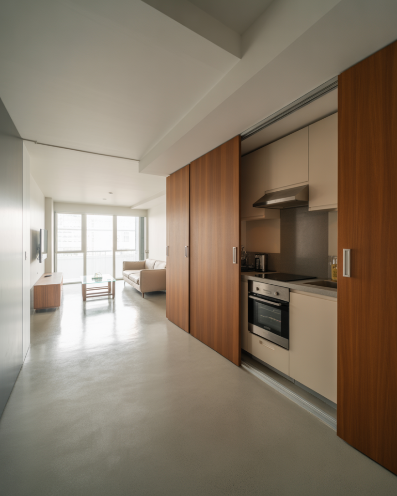 For micro- or basement studios, hiding the kitchen helps to maintain the spacious open layout. When the kitchen is not in use, sliding doors or folding panels can help hide the clutter. I once designed a 400 sq ft apartment where the kitchen was behind bifold doors, and it made the space feel like a living room and not a workspace. In 2026, everything is about beautiful function.