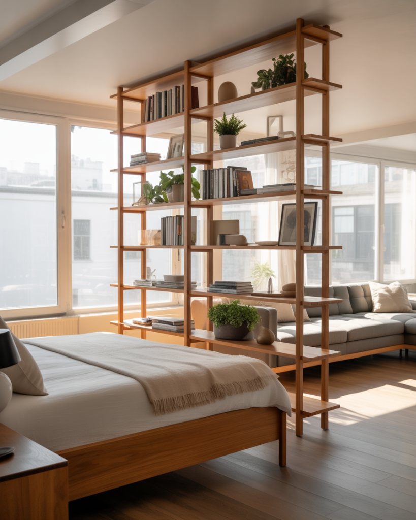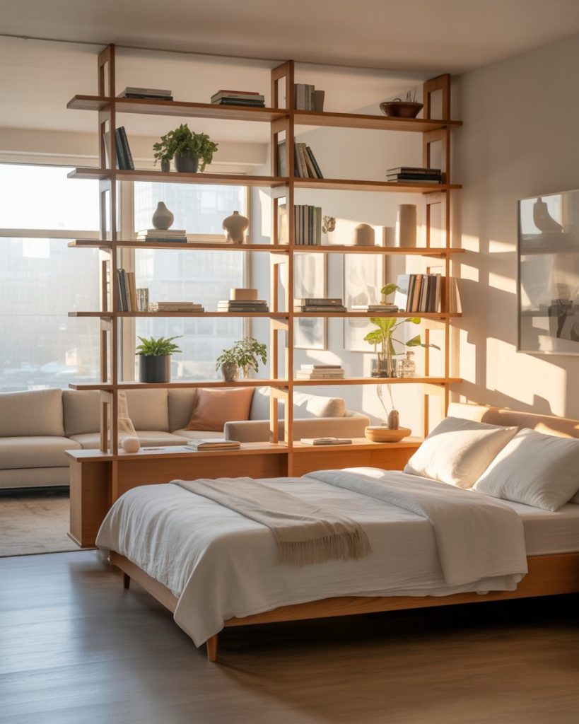 A smart separator alters the perception of a 450 sq ft studio almost immediately. If you’re wanting to add a little functionality without cutting off light and circulation, open shelving or a curtain wall can distinguish the kitchen and the bedroom. In my very first studio, I had a tall bookcase that provided a functional split between the sleeping and living areas—it made the space feel twice as functional. This trick keeps the space feeling large and airy while adding privacy to your layout.