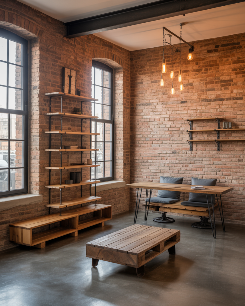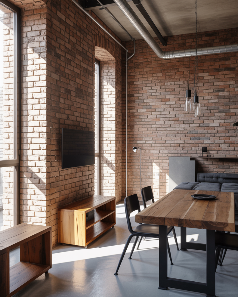 If your studio has exposed beams or basement-style ceilings, an industrial design may suit it best. Use reclaimed wood, metal pipes, and visible brick for a modern, raw atmosphere. In a 450 sq ft layout, these textures add depth and make the room feel large.