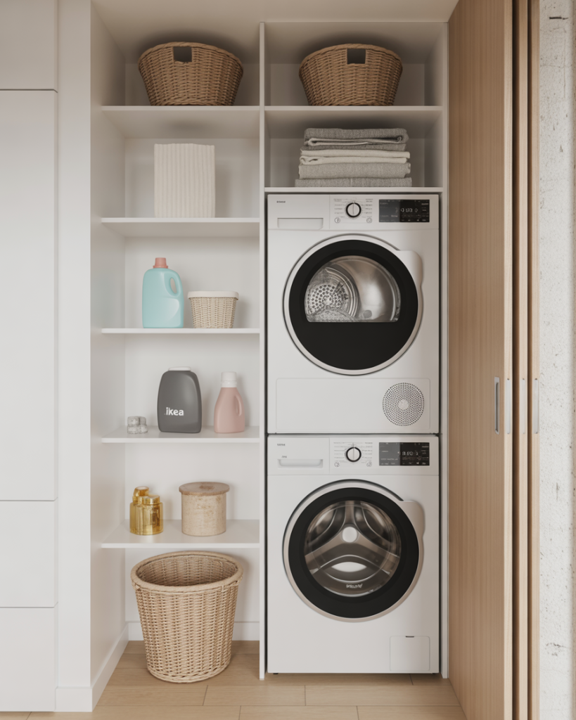 Creating a tiny laundry zone with a stackable setup is one of the most space-saving solutions for small apartments. Many readers tell me how switching from a bulky top loader to a stackable washer and dryer instantly freed room for storage. A vertical design feels practical, airy, and modern, and even budget-friendly brands like Ikea offer slim add-ons to organize detergents. Designers such as Emily Henderson often highlight how a stacked system makes a tight nook feel intentional rather than improvised.