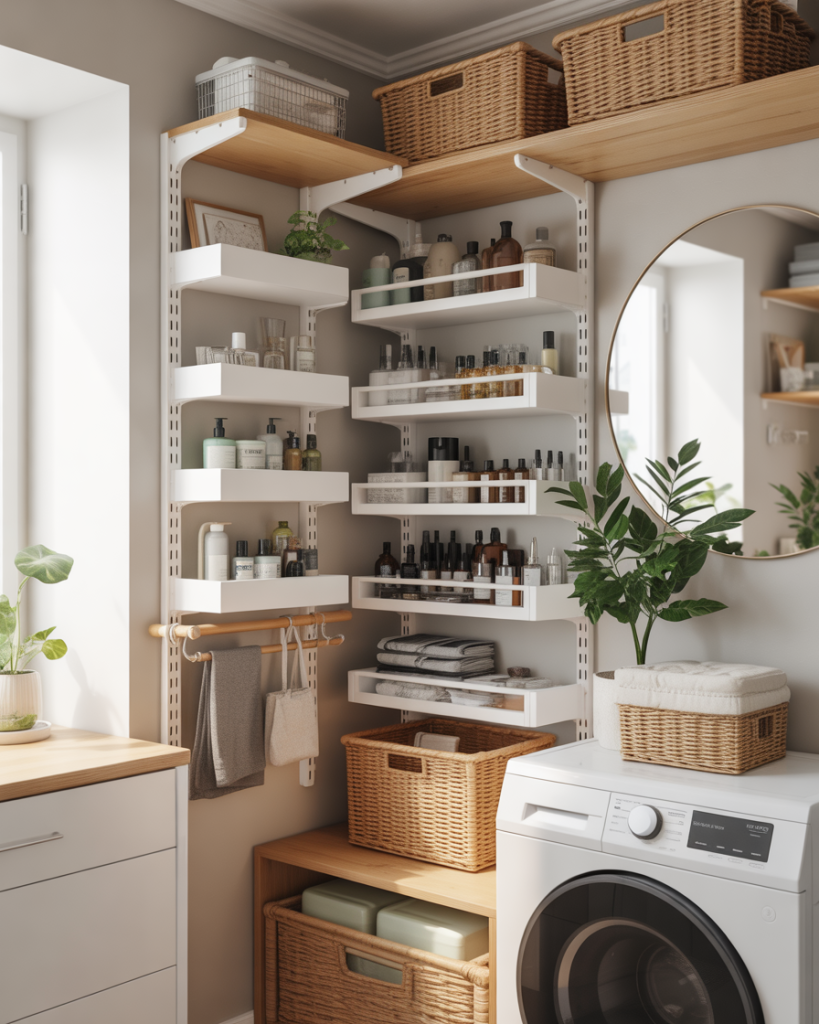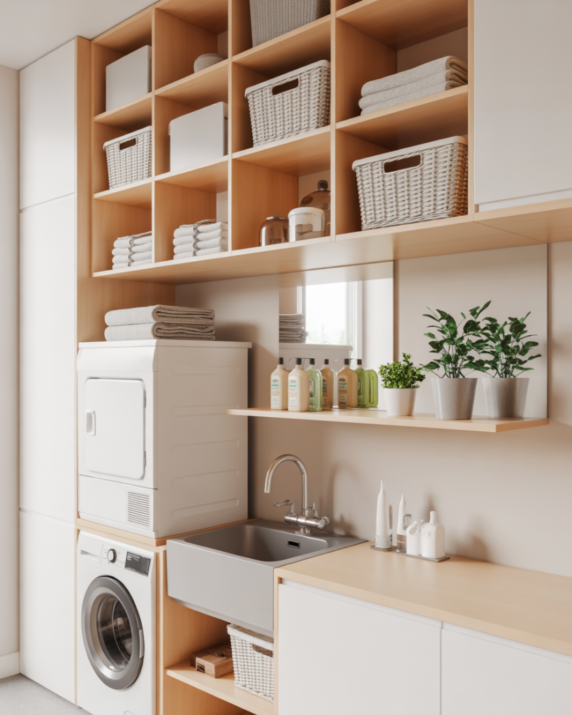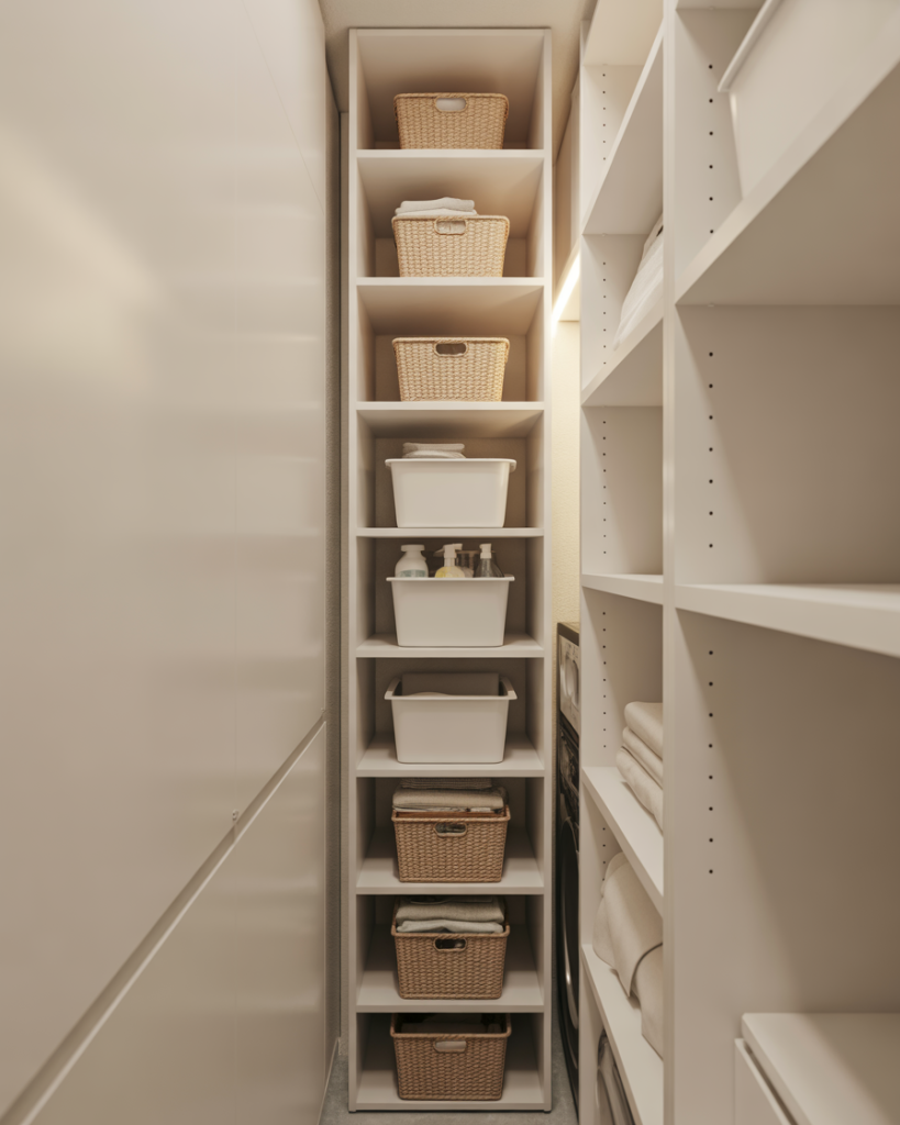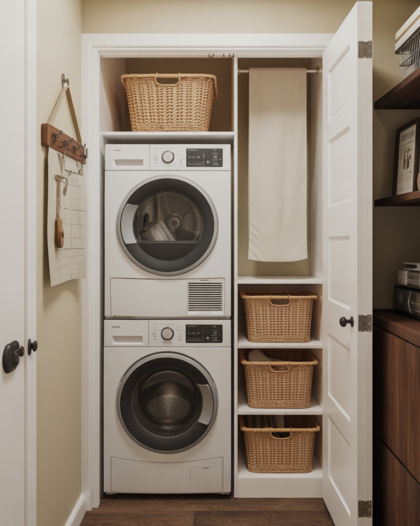 If your laundry space is basically a closet, stackable storage paired with stackable appliances can make the area feel surprisingly efficient. Many homeowners in a small apartment say that building one tall tower of baskets or bins helps tame weekly chaos. I once saw a clever renter use lightweight modular boxes to maximize every inch without drilling. This approach also complements space-saving thinking and keeps supplies reachable. Design editors on Apartment Therapy often recommend vertical systems for micro-laundry corners.