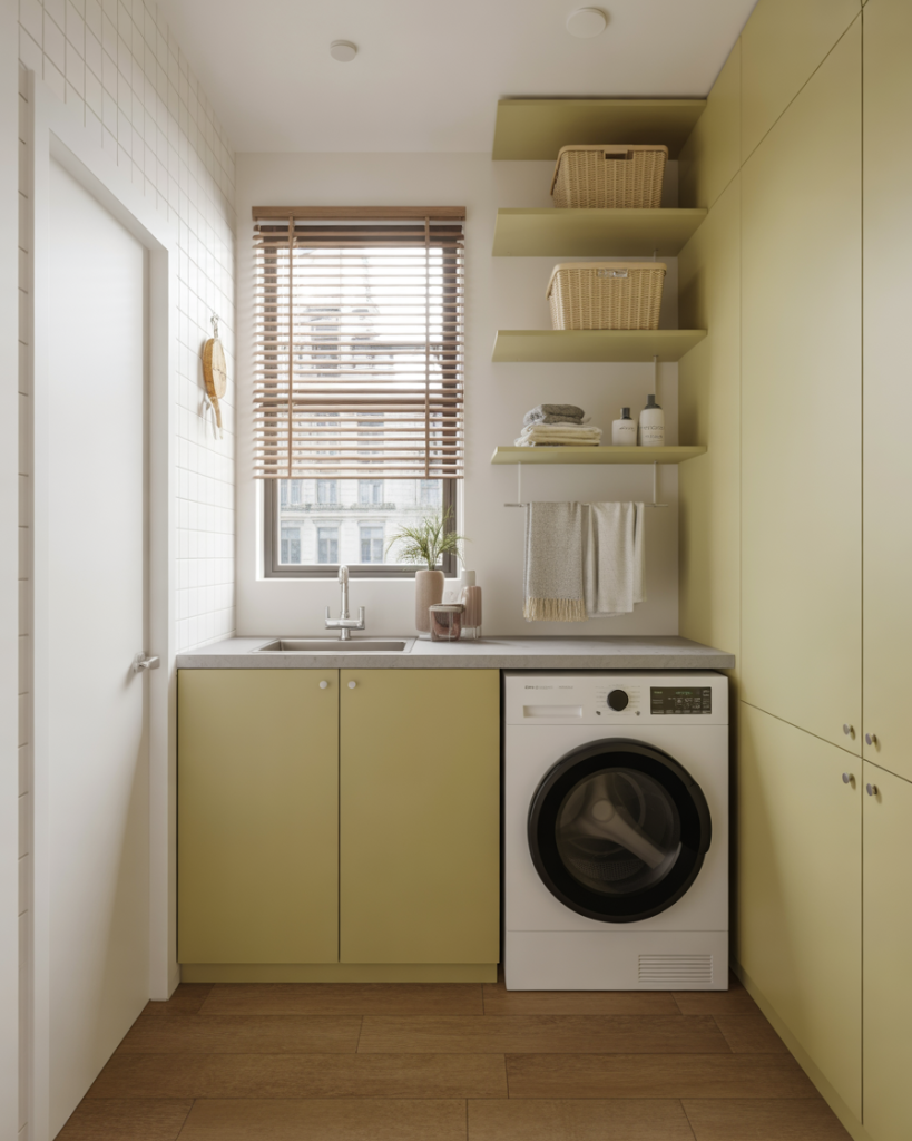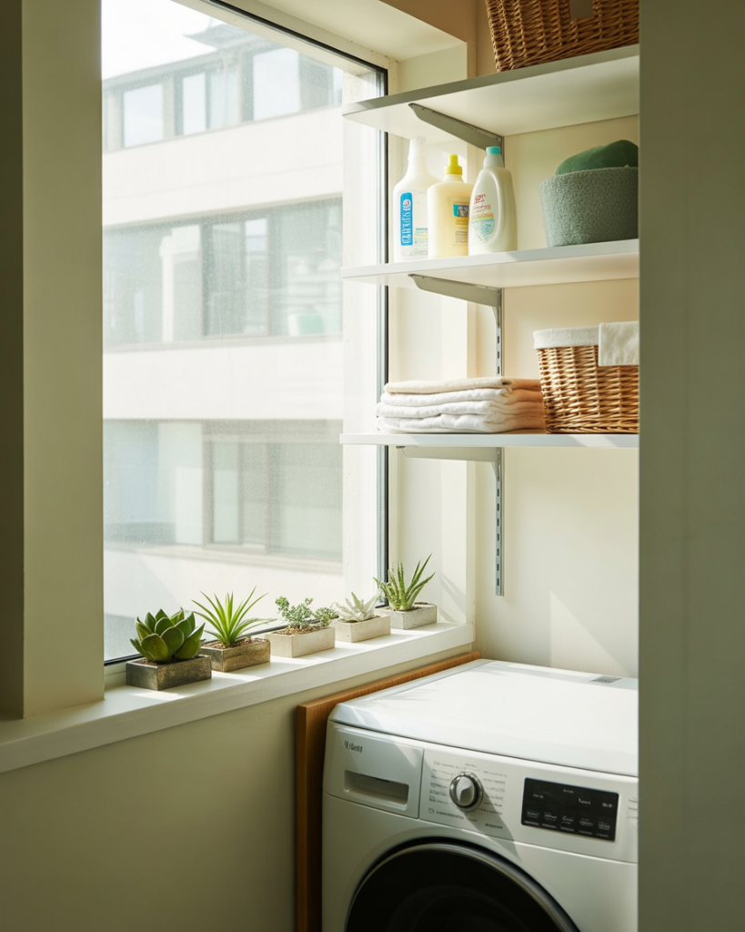 Even the smallest laundry nook feels bigger when there’s a window bringing in natural light. For readers with tight rooms, a bright corner paired with DIY shelving and subtle color can instantly elevate the mood. If your apartment lacks wall space, a narrow ledge under the window can hold detergents or plants. This airy setup pairs beautifully with space-saving bins and compact tools. Designers like Shea McGee often stress how light transforms small, hardworking spaces.