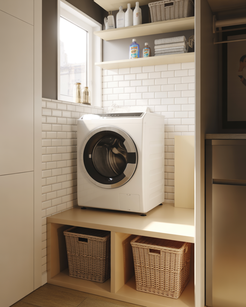 A raised platform under a top loader makes it easier to avoid back strain and leaves the space underneath open for baskets or other stackable storage. One homeowner told me this simple DIY project helped turn their narrow nook into a cleaner and more efficient zone. It is especially handy in small apartments, where every inch is very valued. With careful measurement, the platform can also hold shallow bins for tools and detergents.