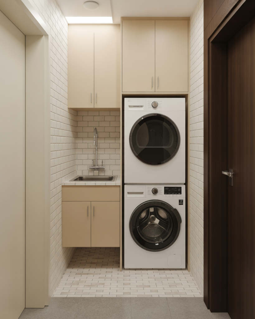 The big functionality a tiny sink brings to a micro laundry with a stackable or stackable-with-sink setup is something people rave about. It is often said to simplify stain removal and handwashing without losing a space-saving design. I have noticed this being done very well in narrow closets where a small basin is able to easily tuck into the corner. Open space is best maintained when designers use wall-mounted faucets.