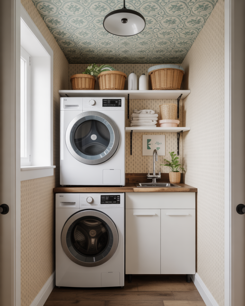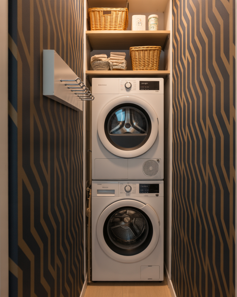 A bold wallpaper can turn a cramped laundry area into a stylish little retreat—especially when paired with stacked machines to maximize floor space. Patterned walls hide scuffs and make the area feel intentional, even if it’s just a small closet in an apartment. I once helped a friend install a renter-safe mural behind their stackable unit, and it truly changed the whole atmosphere. Many decor experts recommend peel-and-stick options for renters wanting personality without commitment.