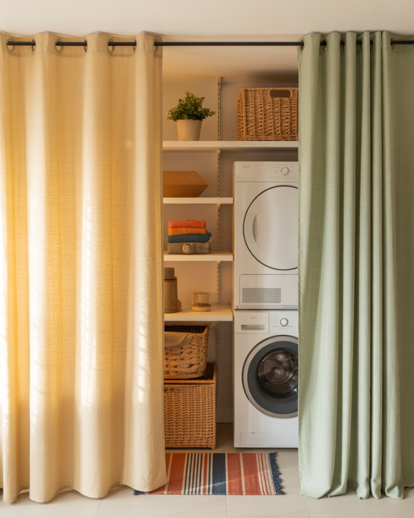 In a small studio or efficiency apartment, soft curtains can add warmth and flexibility to the design by providing the ability to spatially divide the room while hiding laundry storage and machines. A vertical curtain rod paired with a fabric sheet creates a calming and cohesive design in a cramped corner. To help maintain visual cleanliness in the design, the curtain can be paired with some simple storage baskets. This design has been recommended by many rental decor bloggers for spaces where doors cannot be installed.