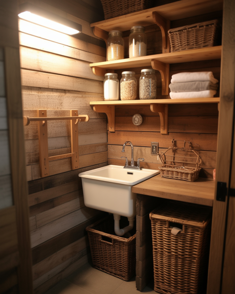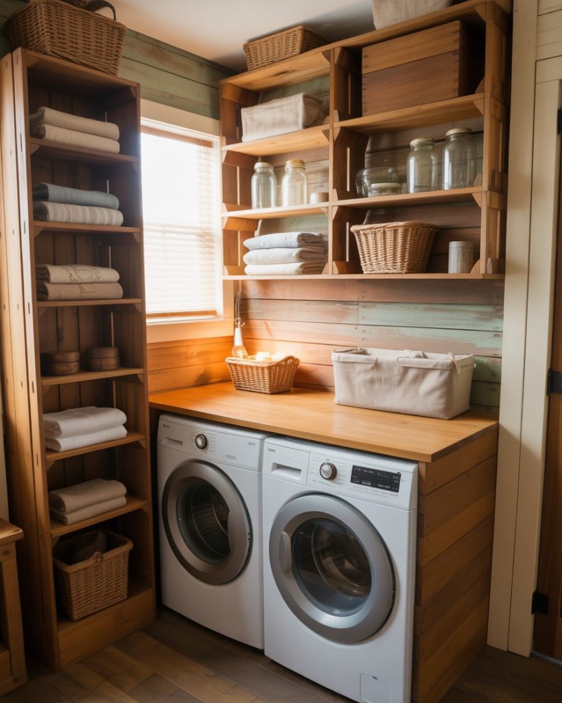 A rustic laundry room proves you don’t need a big space for big character. Pairing compact machines with warm wood accents and a tiny sink can feel surprisingly cozy. One couple told me they refreshed their tiny room with peel-and-stick boards and soft lighting for under $100. This look blends beautifully with storage crates, small shelves, and relaxed textures. Bloggers like Liz Marie often show how rustic charm thrives even in tiny homes, adding warmth without clutter.
