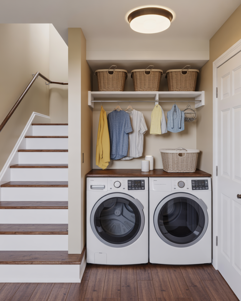A small landing area near the stairs can become a hidden laundry cubby with compact appliances and storage baskets. Homeowners often overlook this spot, yet it’s ideal for machines that fit flush against the wall. Paired with warm lighting and a tiny organizer rail, the area becomes surprisingly efficient. It’s a clever way to reclaim awkward architecture.