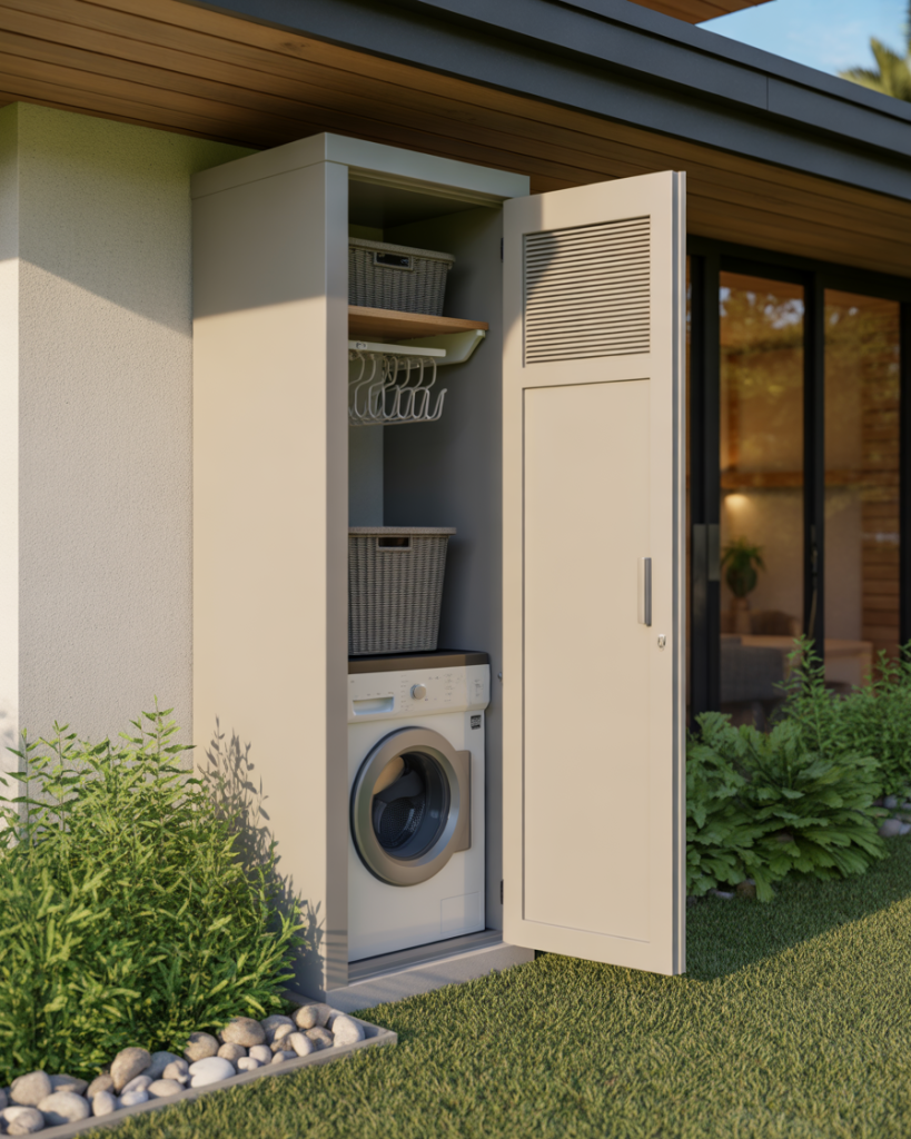 A compact outdoor closet with a door and ventilation panel keeps machines safe while freeing indoor space. Many families in warm climates say this setup feels refreshing and quiet. Adding stackable storage or drying hooks inside enhances functionality. It’s a smart alternative when interior square footage is scarce.