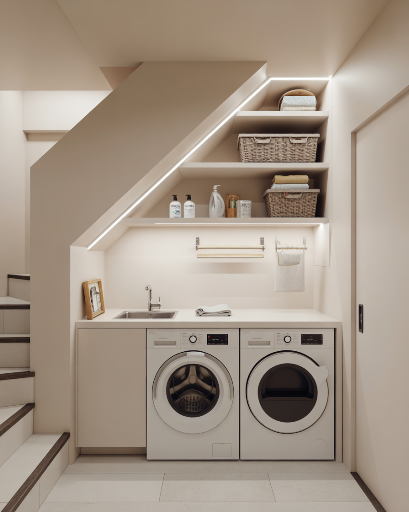 Placing laundry machines under the stairs is a classic space-saving small-apartment hack. This awkward zone often goes unused, yet it can perfectly house a top-load or slim front-load machine with simple storage shelves. A neighbor once told me this move completely changed their hallway flow. The key is good lighting and accessible shelves for detergents. Many designers praise under-stair conversions for transforming dead space into high-value utility.