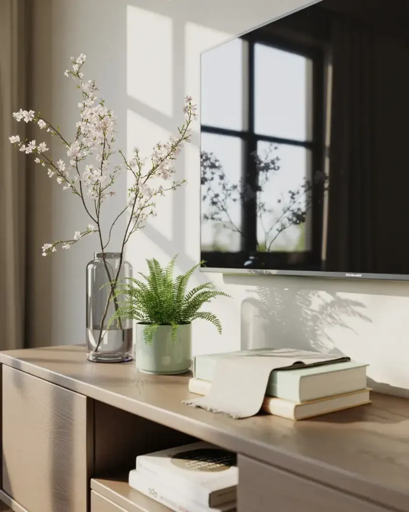 Sometimes the most powerful statement is a quiet one. A simple white console with just two or three small plants and nothing else is the kind of setup that photographs beautifully on Pinterest precisely because of its restraint. This approach works in any room but feels particularly right in spaces that are trying to cultivate a calm, spa-like energy—the kind of room you walk into and immediately feel your shoulders drop. The plants add life and color without visual noise; white keeps the surface receding into the background; and the TV, when turned off, becomes a large dark mirror that doesn’t compete with the careful simplicity of the arrangement.