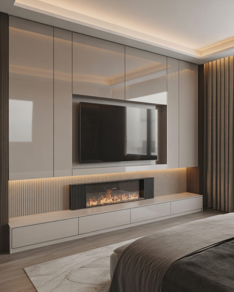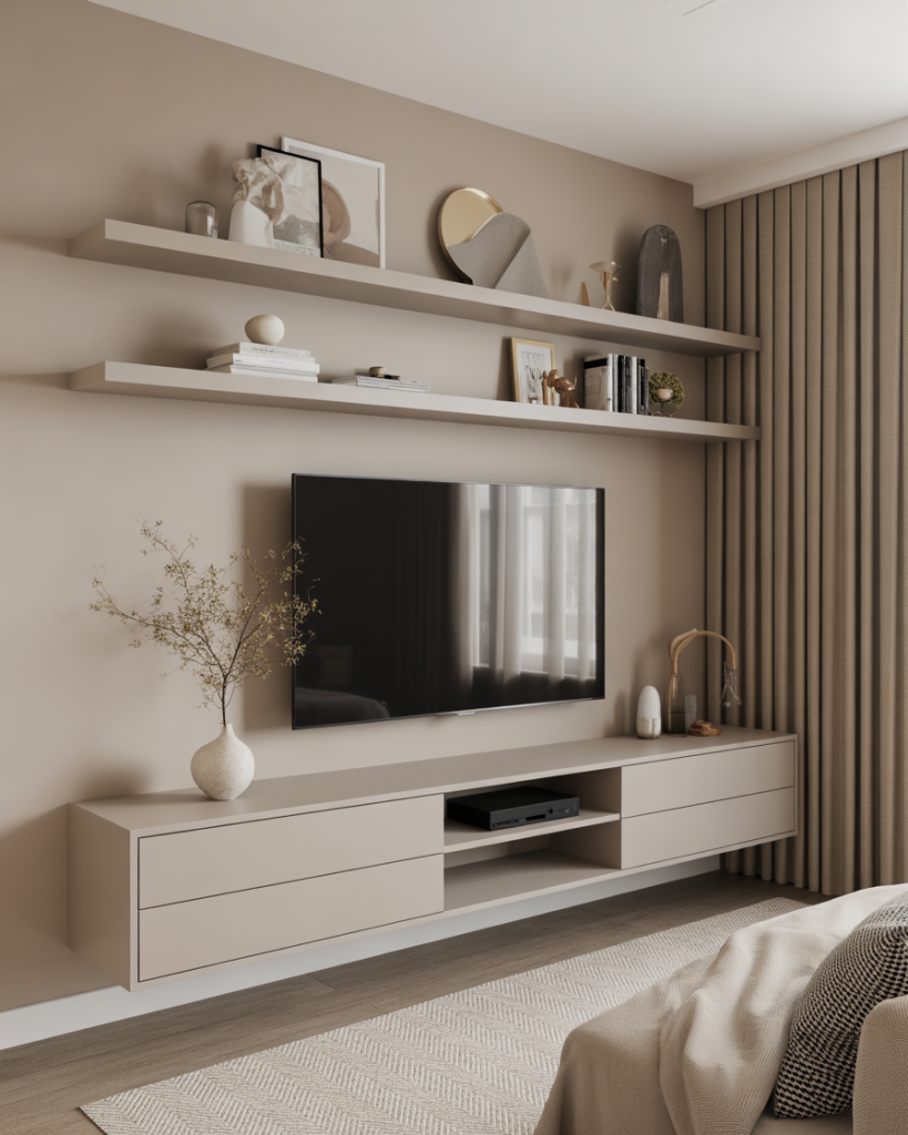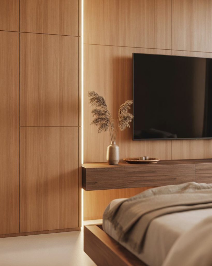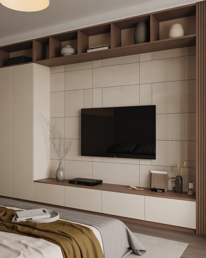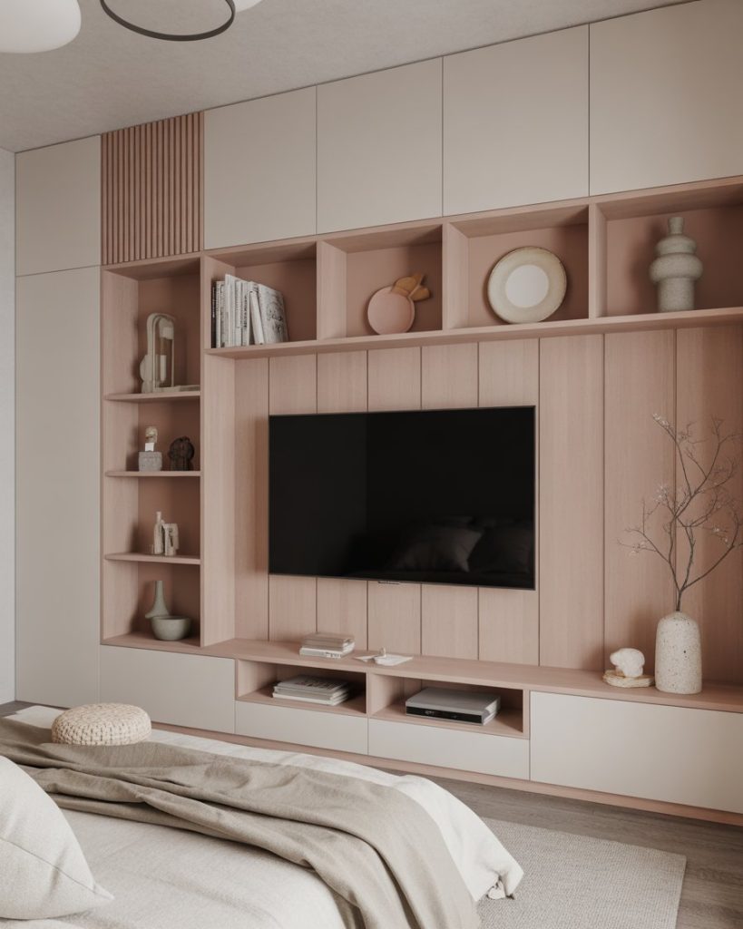 A bedroom TV wall in a minimal or Japandi style creates a restful retreat. Soft textures, warm lighting, and subtle storage help maintain calm energy. Designers from Havenly often note that bedrooms benefit from quiet, uncluttered arrangements that minimize visual noise.