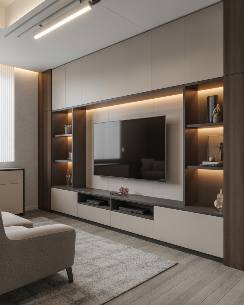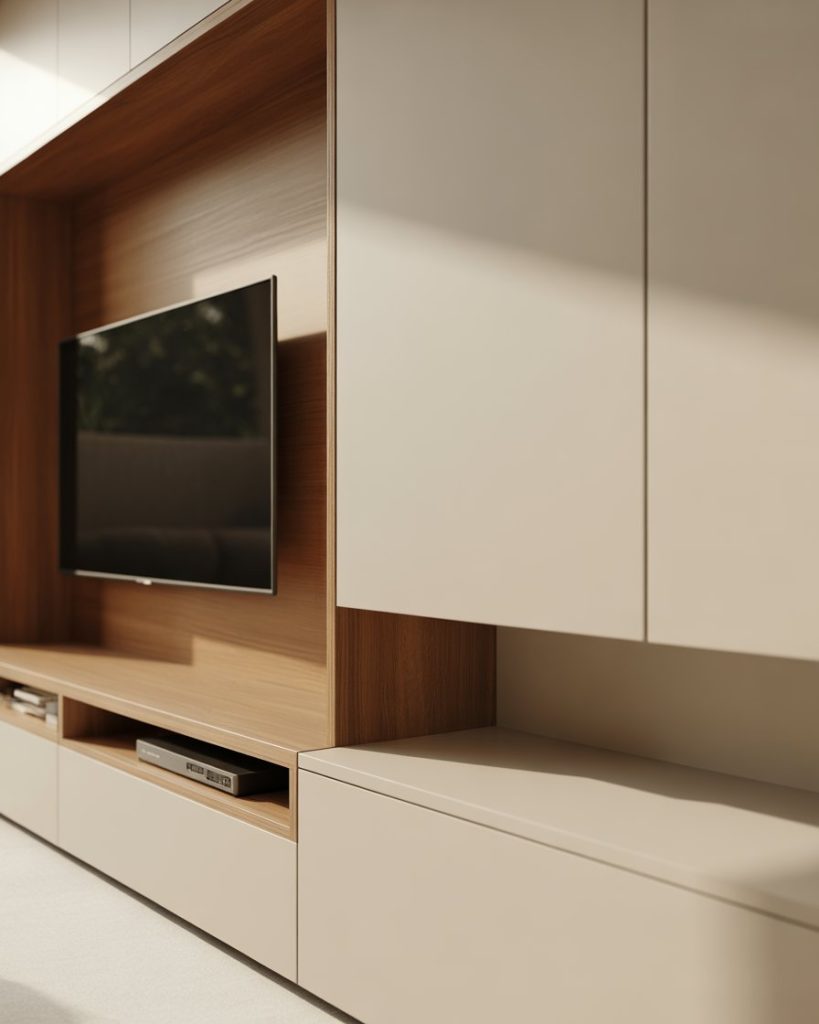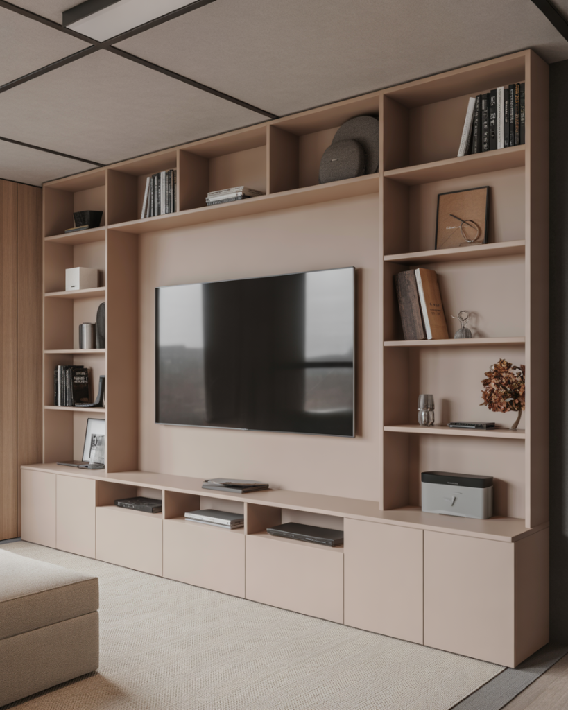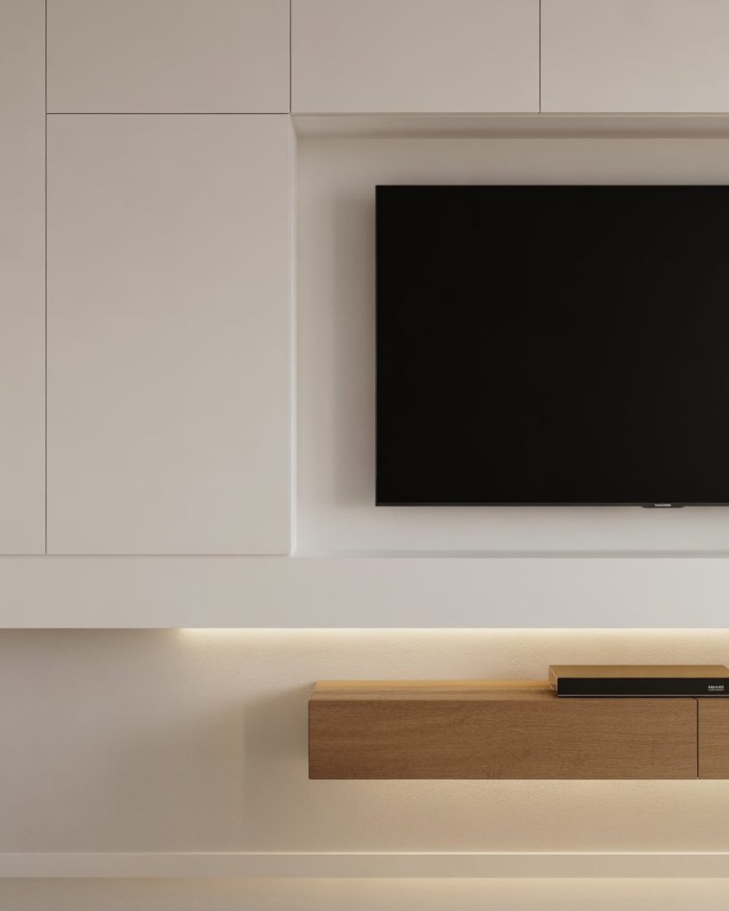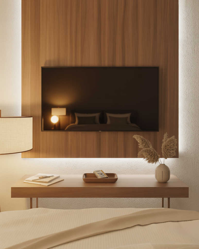 A bedroom TV wall in a minimal or Japandi style creates a restful retreat. Soft textures, warm lighting, and subtle storage help maintain calm energy. Designers from Havenly often note that bedrooms benefit from quiet, uncluttered arrangements that minimize visual noise.