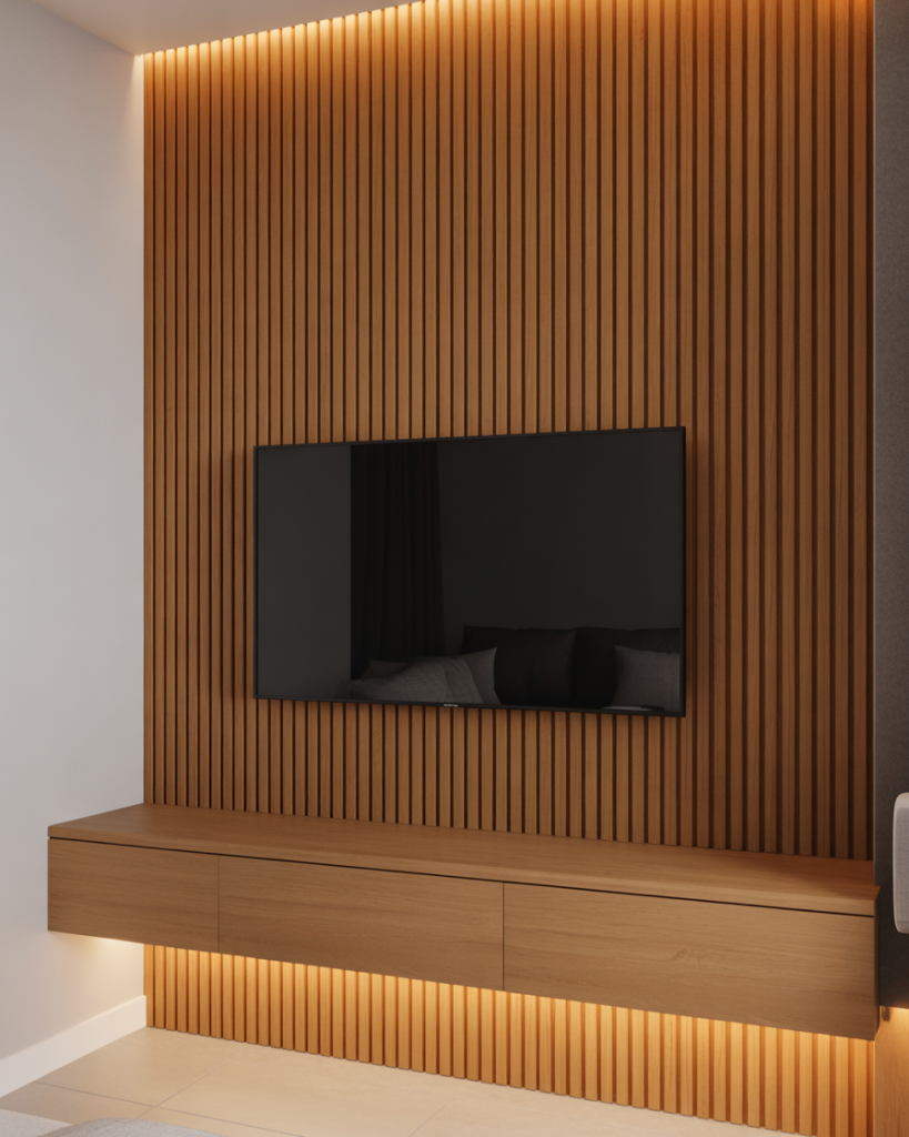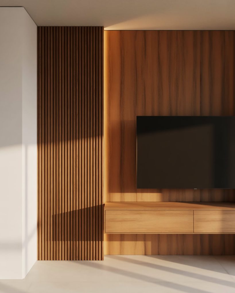 A modern wall with vertical wood slats adds warmth and rhythm, making it ideal for a living room or small space. This minimal approach feels natural and calming, and many designers praise how slats balance technology with organic texture. I’ve seen clients instantly feel their room expand visually thanks to the gentle, linear flow.