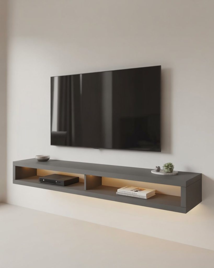 A sleek floating console paired with a modern TV wall keeps the look simple and streamlined, especially for small-space homes. This layout gives the room breathing room while still accommodating everyday needs. Designers on sites like Domino often highlight how airy, floating pieces reduce visual clutter and add a light, elegant lift.
