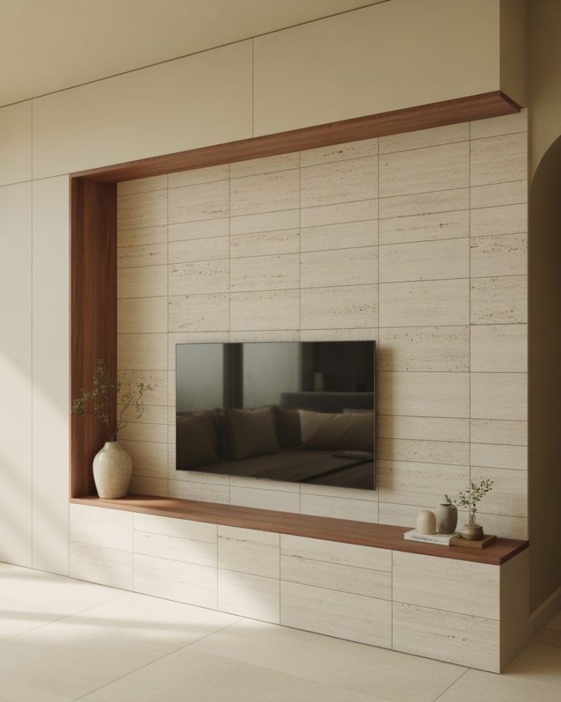 A calming blend of Japandi elements and soft stone surfaces creates an elegant yet grounded atmosphere. Light stone tiles, natural wood, and minimalist décor work beautifully in both bedroom and living room spaces. I often notice how this look appeals to those craving serenity without sacrificing style.