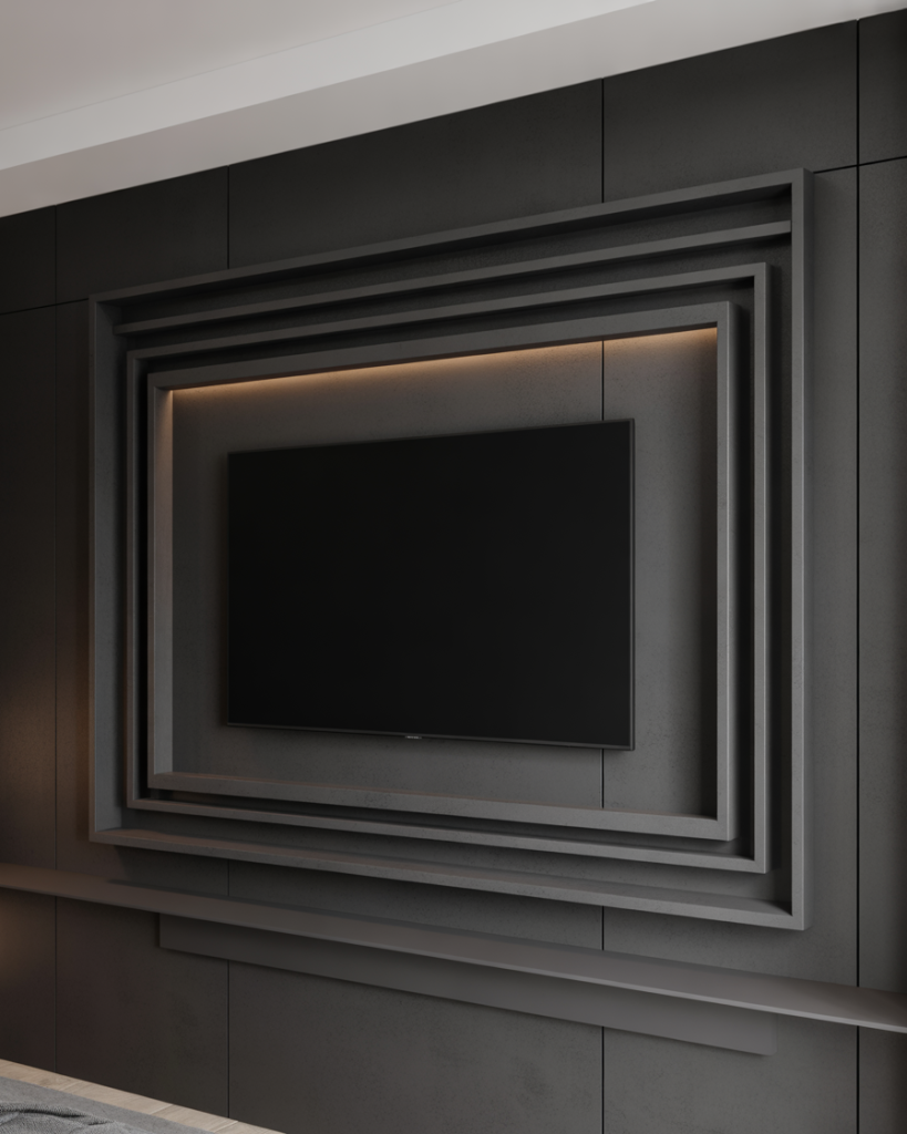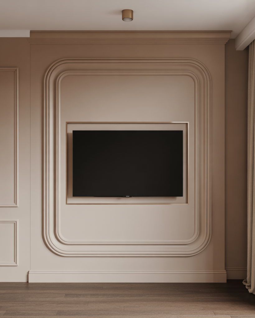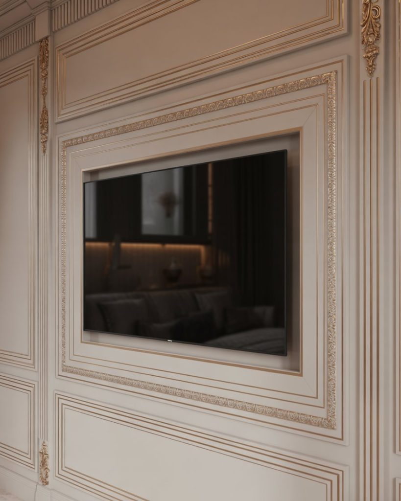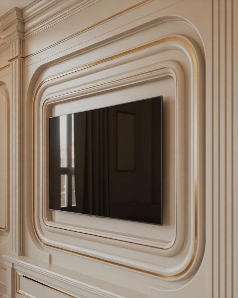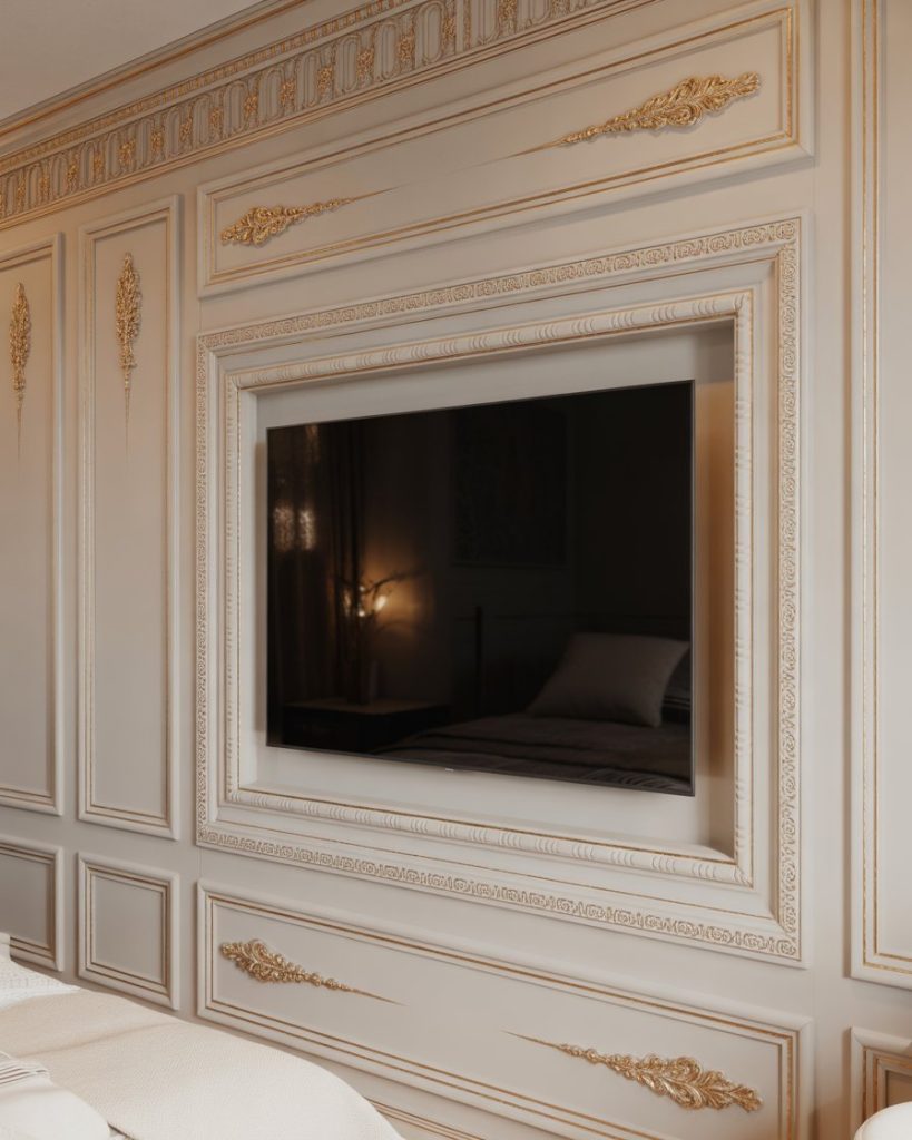 A luxury classic carved wall design surrounds the TV with ornamentation while still keeping the layout functional. It brings an elegant atmosphere to a living room or formal bedroom. Influencers in traditional design often highlight carved frames for adding personality without overwhelming the space.