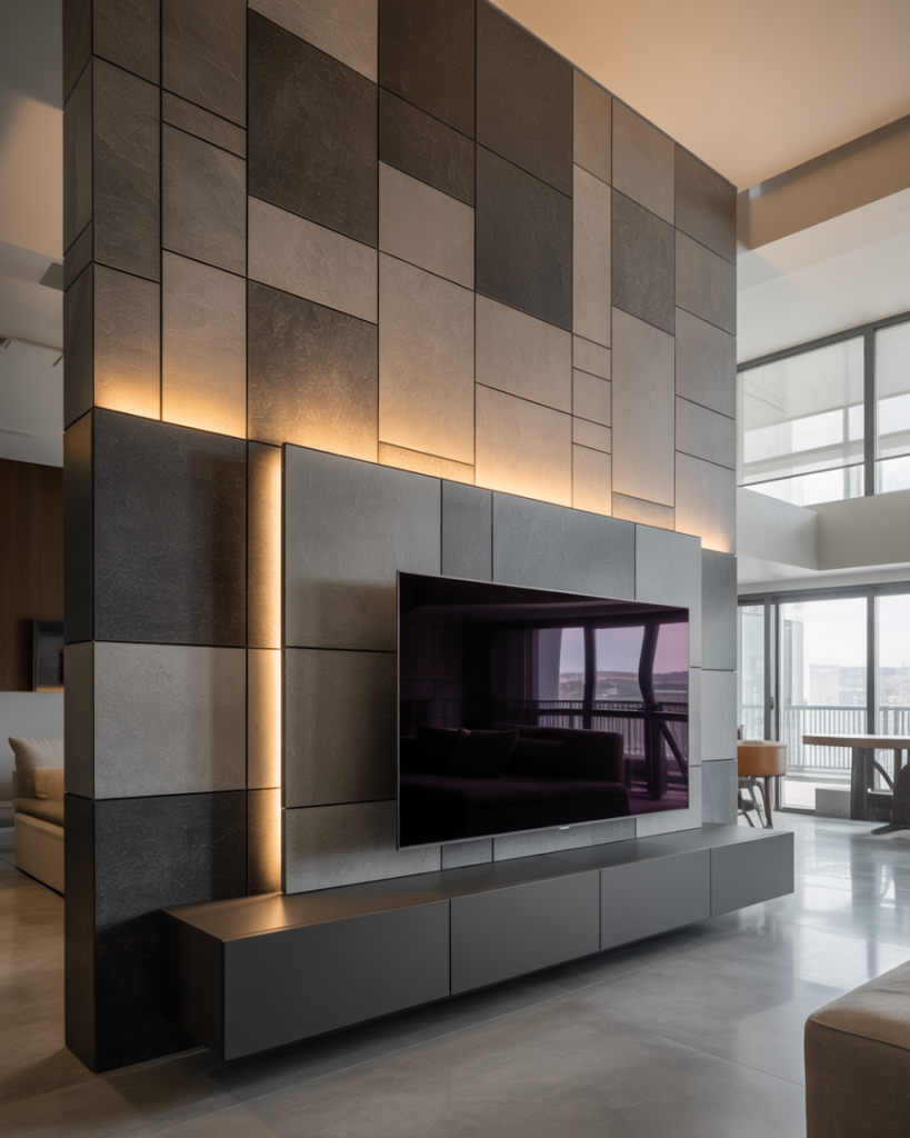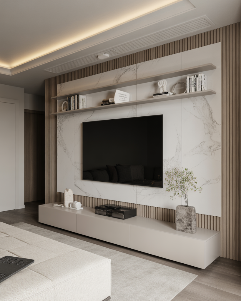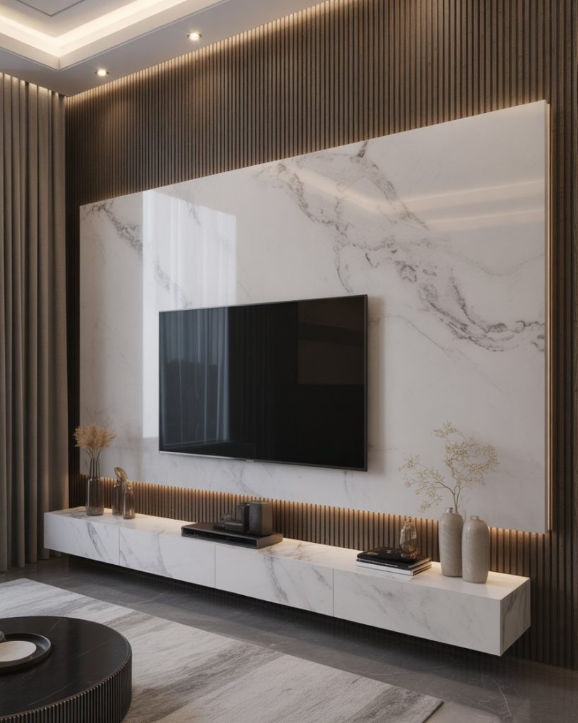 A double-height TV wall transforms large living areas into showstoppers. Using tall wood, stone, or gypsum panels adds drama while keeping the look modern and elegant. In lofts and open homes, I’ve seen this design create an instant sense of grandeur without overwhelming the space.