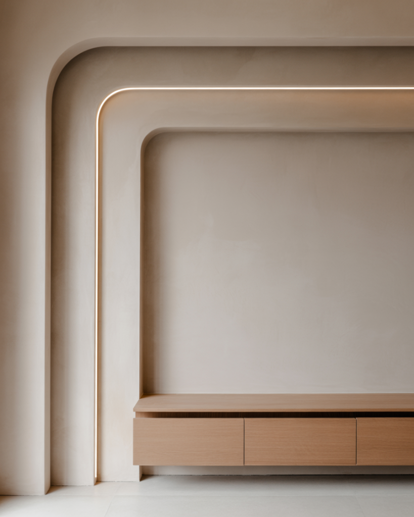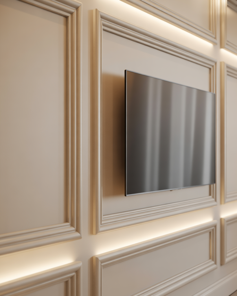 A neoclassical TV wall is featured by soft curves, molding, and an elegant frame in a lightweight and luxury design. It fits extremely well in a living room or formal office space. I saw homeowners implement soft beige tones for a simplified look but with richness and detail, similarly to the designs I saw in Architectural Digest.