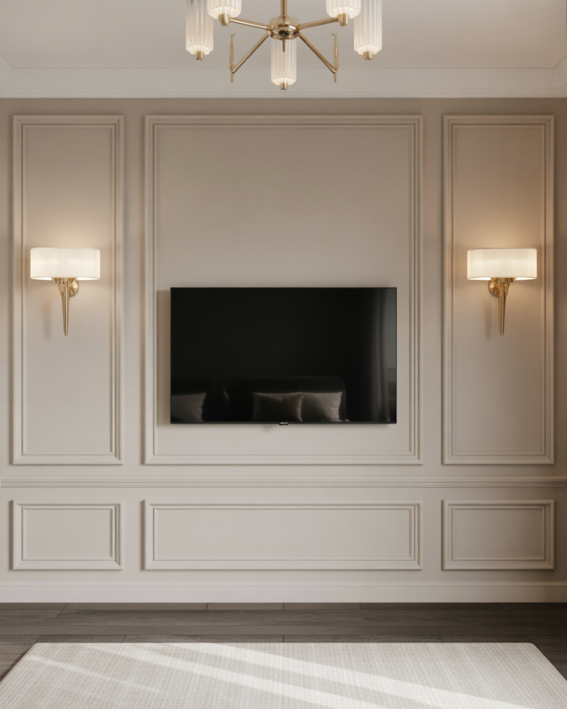A classic paneled wall with symmetrical placements around the TV adds timeless charm. It’s popular in both bedroom and living room spaces where homeowners want structure without heaviness. Traditional designers often emphasize symmetry as a calming design principle that still feels refined.