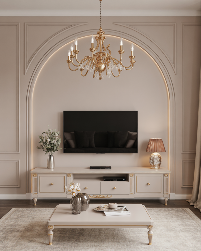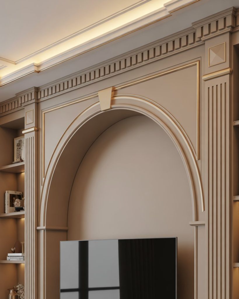 A neoclassical arch around the TV adds a gentle architectural softness. This look works beautifully in an elegant living or sitting room. Moldings, creamy tones, and curved shapes make the space feel more inviting—something many traditional design enthusiasts still admire today.