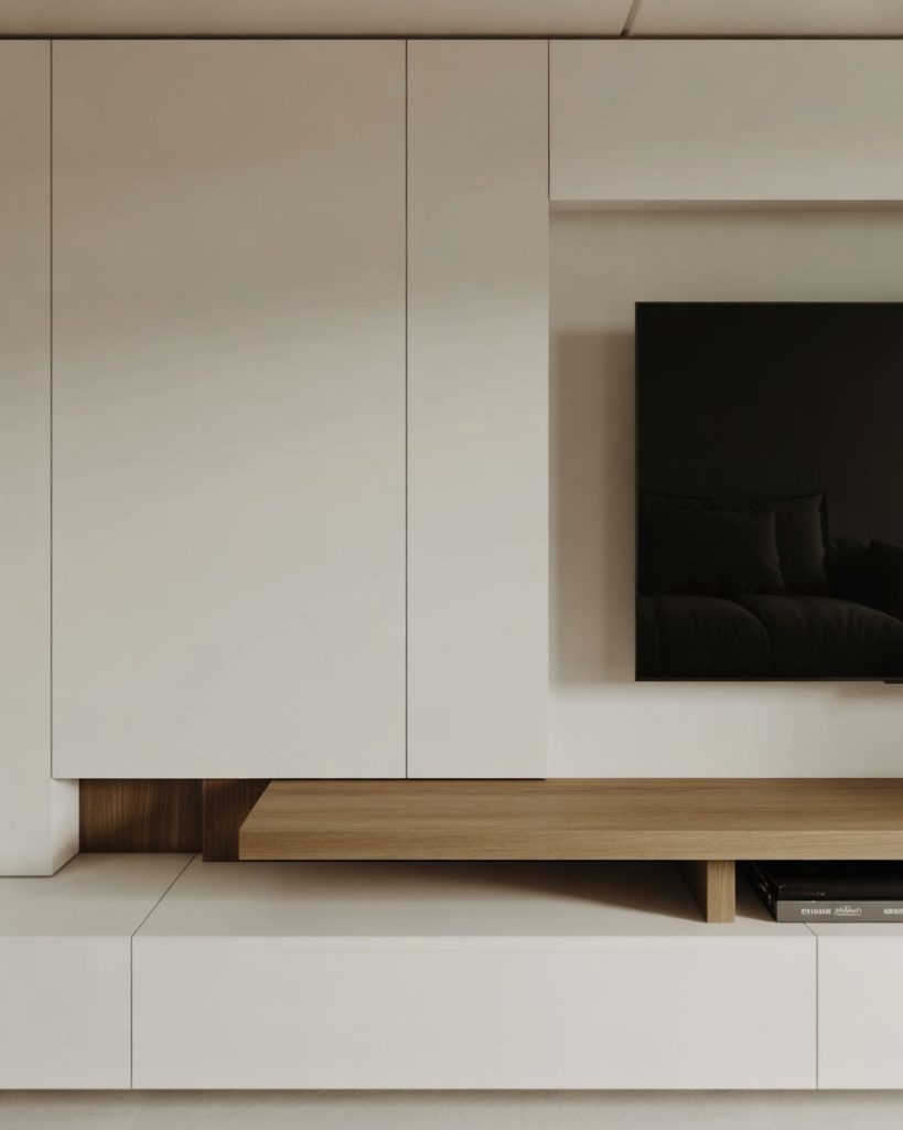 Combining Japandi styles and having refined Japanese lines and functionality brings calmness around the TV area in the room. That is ideal for the bedroom or a compact small space. Designers like Marie Kondo also confirmed the comfort of simplicity, making light wood, soft fabrics, and calm earth-tone colors fitting for the area.