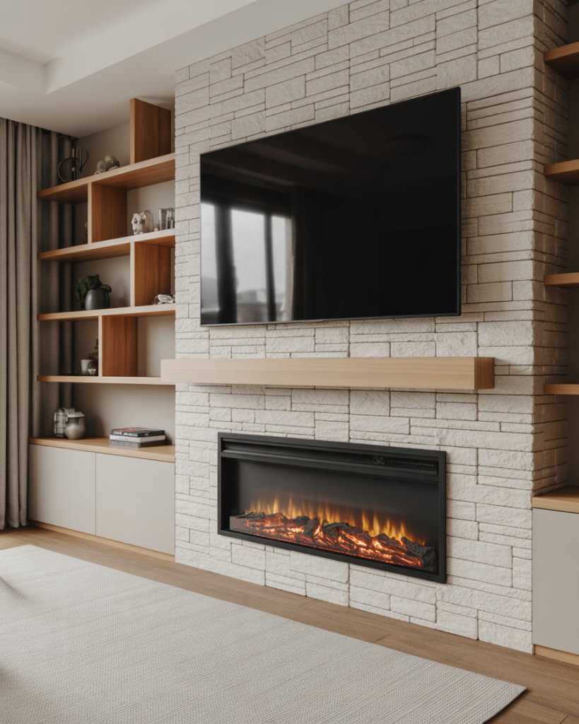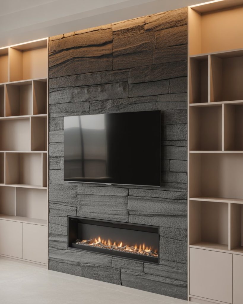 A fireplace paired with a TV above or beside it brings warmth and classic comfort, yet modern designers make it feel sleek. This pairing has grown popular in 2026 because it blends ambiance with tech. I’ve seen families gather around setups like this during winter, making the wall the heart of the home.