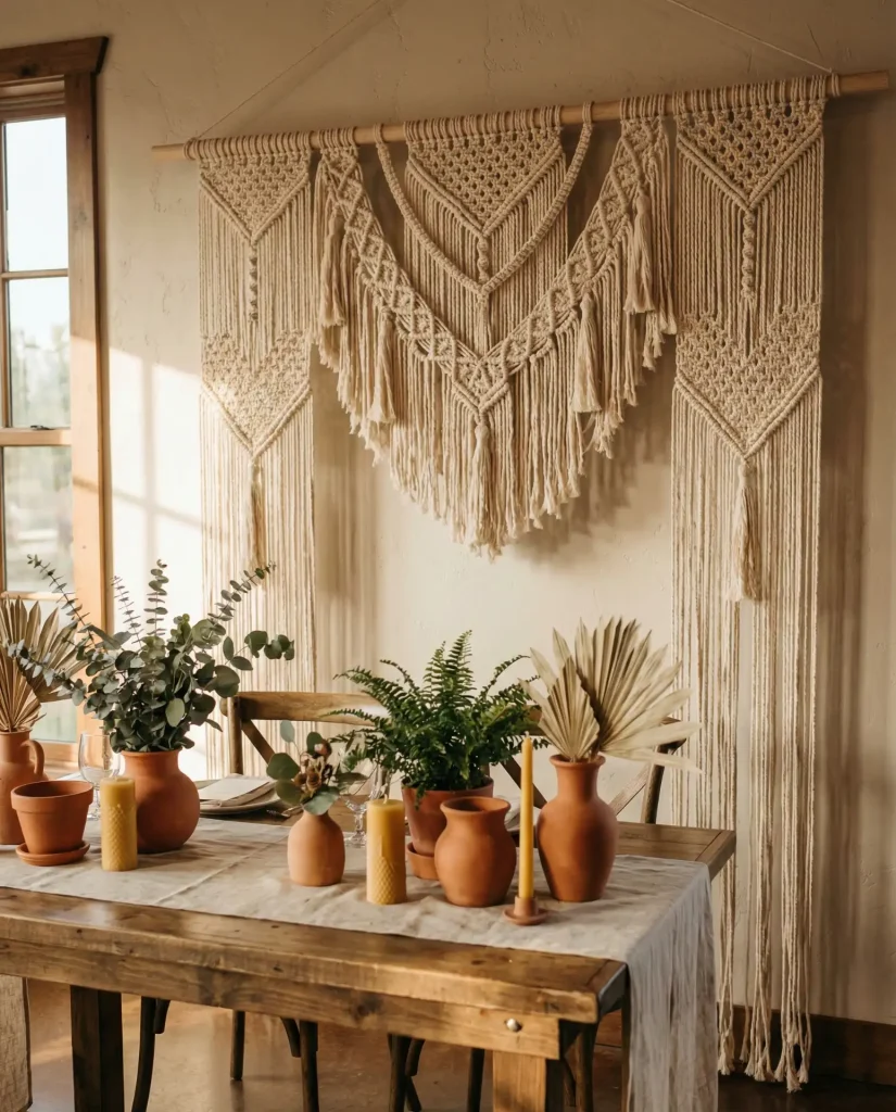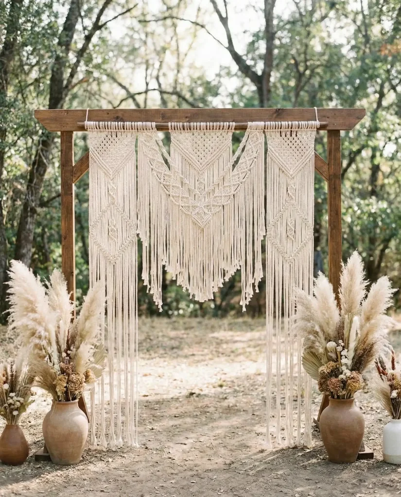 Budget angle: DIY macramé is surprisingly doable if you have time—countless YouTube tutorials walk you through basic knots. A custom handmade piece can run $300-800 depending on size, but rentals are often available for $75-150. Many couples keep these after the wedding as bedroom or living room decor, making them a purchase rather than a pure expense. They photograph incredibly well, which is why Pinterest is full of them right now.