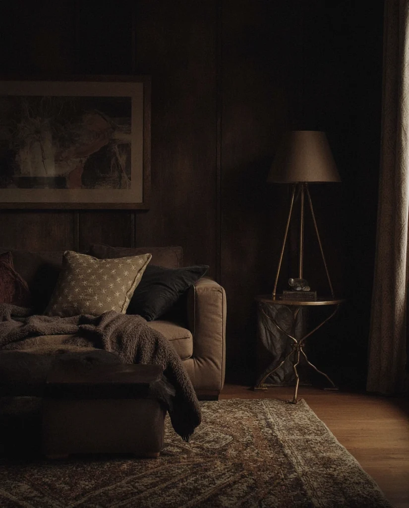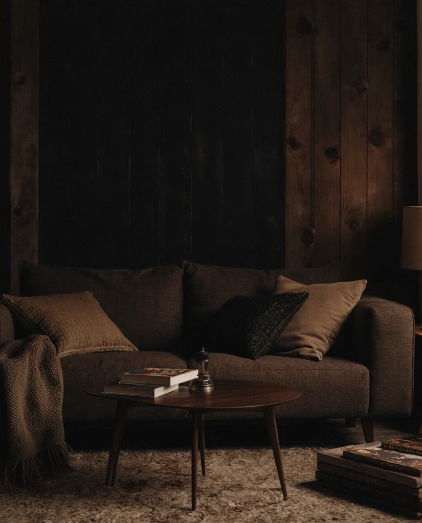 A Dark Western palette adds richness through deep browns, charcoal walls, and layered natural textures. This approach works well in a living room where you want atmosphere without losing warmth. Pairing rugged wood with soft throws gives the space both strength and comfort, something many designers at House Beautiful say embodies the 2026 Western revival. It’s ideal for movie nights, gatherings, or anyone wanting a cocoon-like feel.