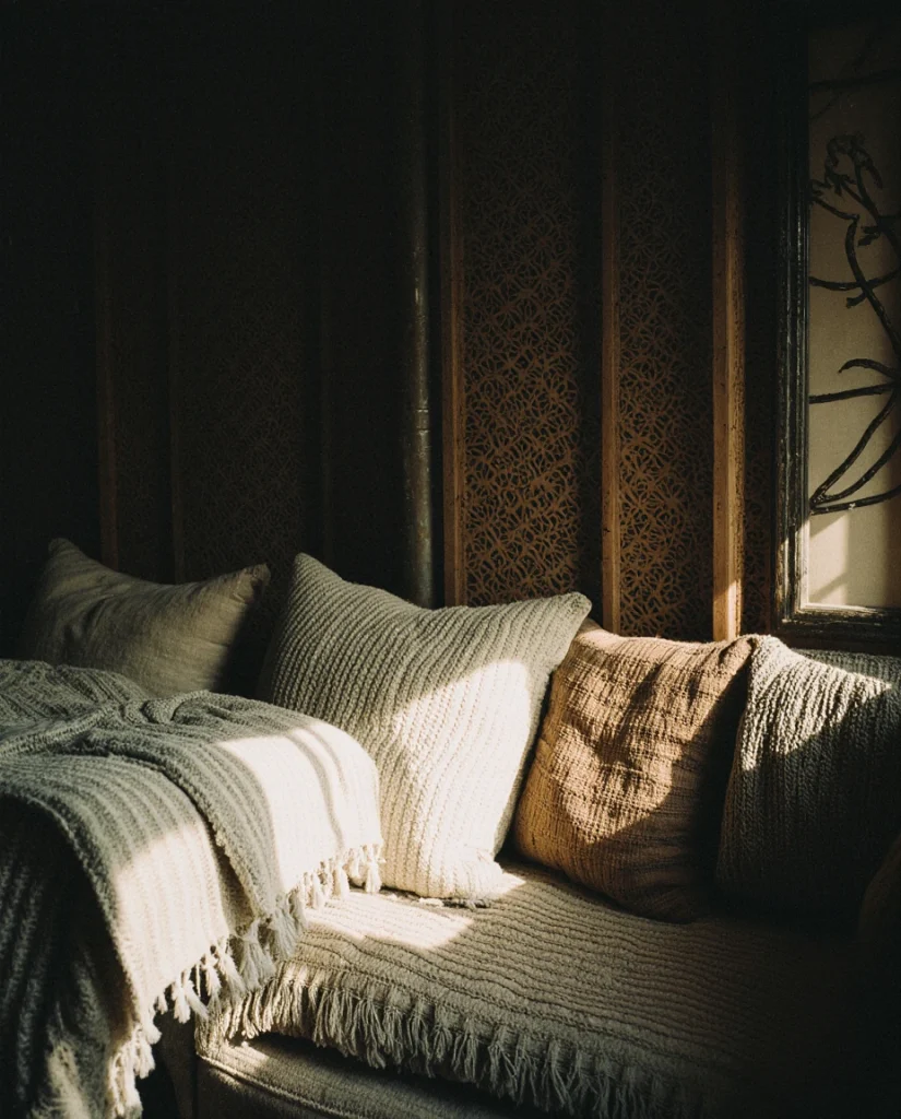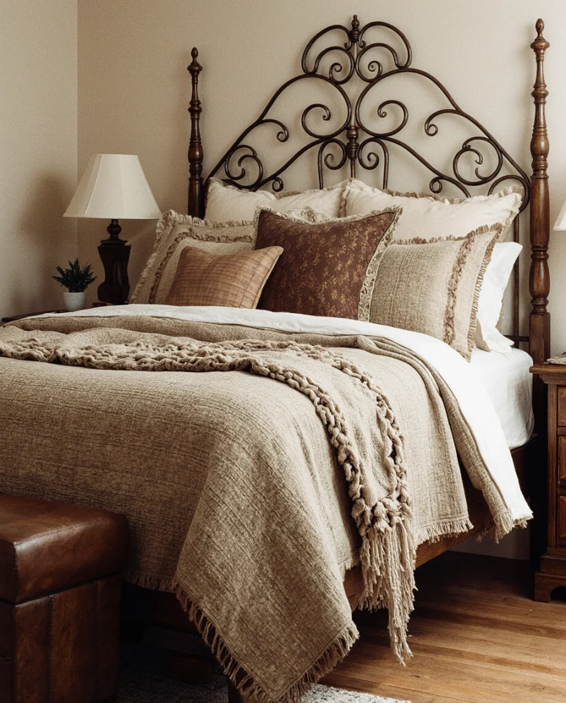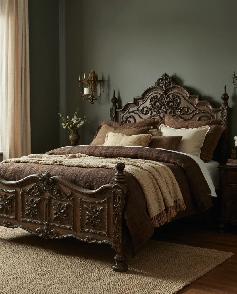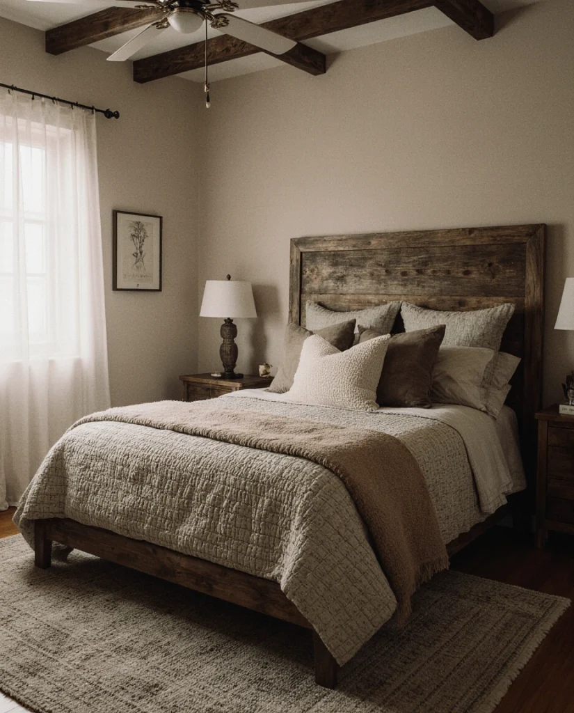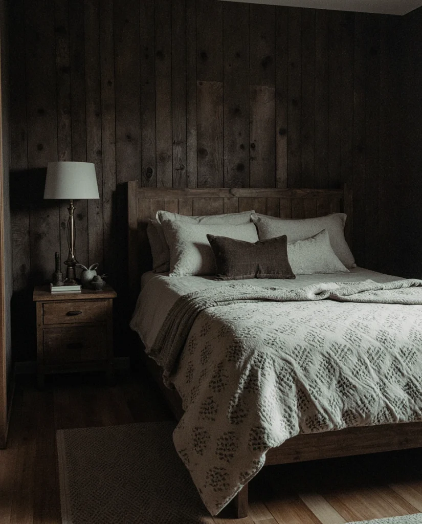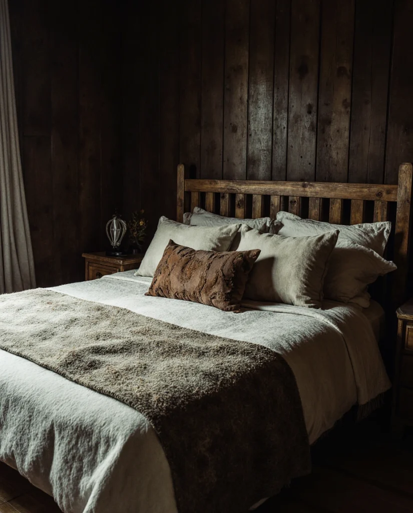 A bedroom styled with rustic elements gains depth when paired with moody colors—deep browns, charcoals, or muted greens. This approach feels naturally cozy, especially for people who want a retreat-like atmosphere after long days. Many stylists recommend mixing rough wood with soft textiles for balance.