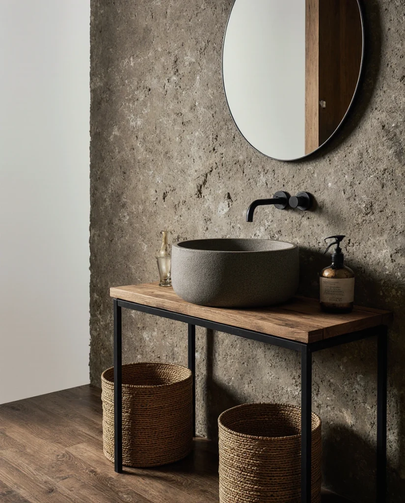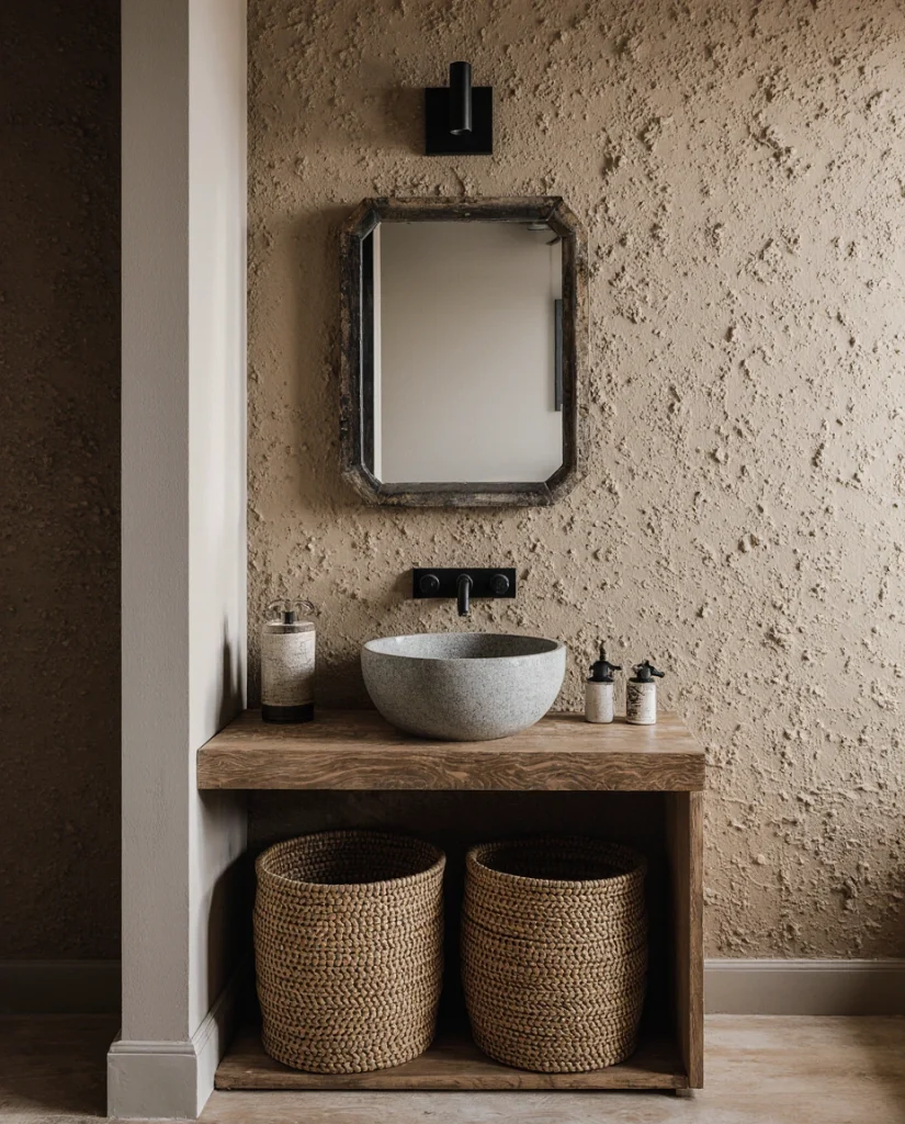 A rustic Western bathroom feels grounded when using stone sinks, matte fixtures, and textured walls. This look fits both small and larger spaces because it focuses on authentic materials rather than clutter. Adding woven baskets or simple DIY decor enhances the natural feel while maintaining practical storage. Many interior stylists praise this for creating spa-like calm in everyday homes.