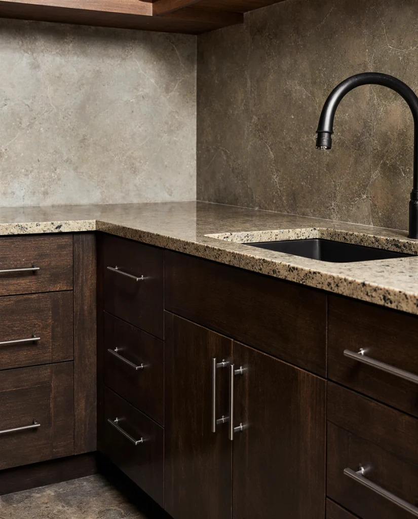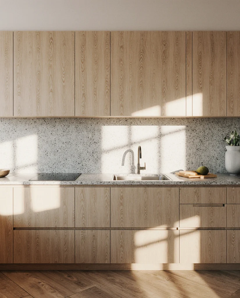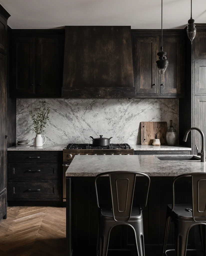 A Moody Western Kitchen blends deep hues, grainy wood cabinets, and smooth stone countertops. This mix gives a dramatic but refined look ideal for modern families. The style pairs well with open-plan homes where the kitchen must feel intentional and stylish. Its strength lies in the contrast between minimal surfaces and bold tones, which designers predict will trend well into 2026.