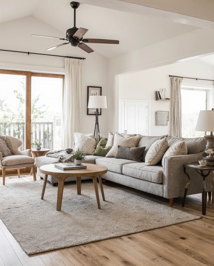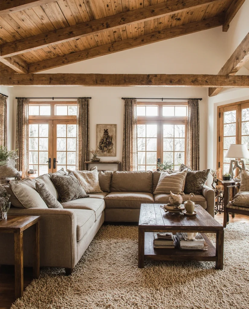 A ranch-style living room rustic blend highlights distressed leather, antique tables, and warm-toned textiles. This idea feels timeless and works beautifully for families who want durability and personality. The mix of antique and natural textures tells a story, so the room feels lived-in and welcoming.