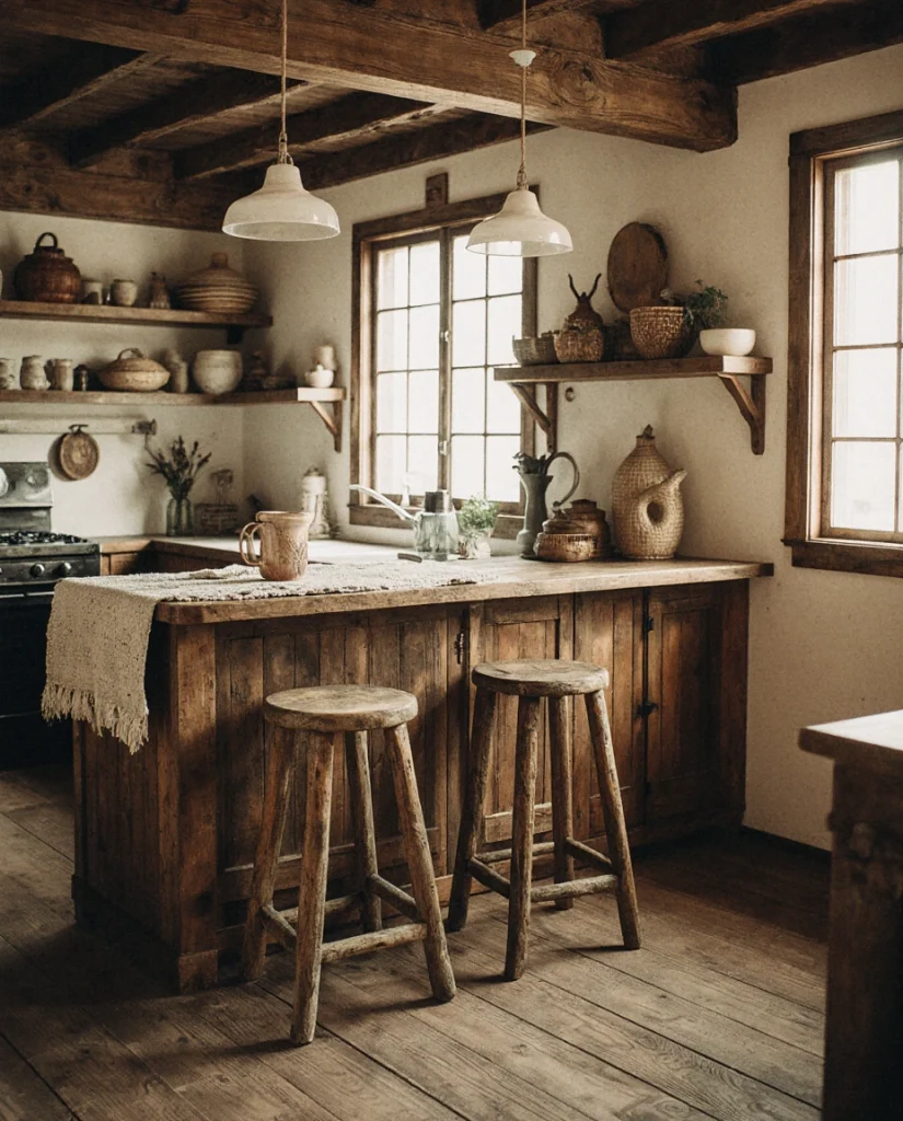 A ranch-style kitchen becomes memorable when you combine practical layouts with vintage touches like weathered wood, antique stools, or textured ceramics. This idea fits homes where cooking is social, encouraging relaxed gatherings. A touch of country character helps the space feel grounded and inviting.