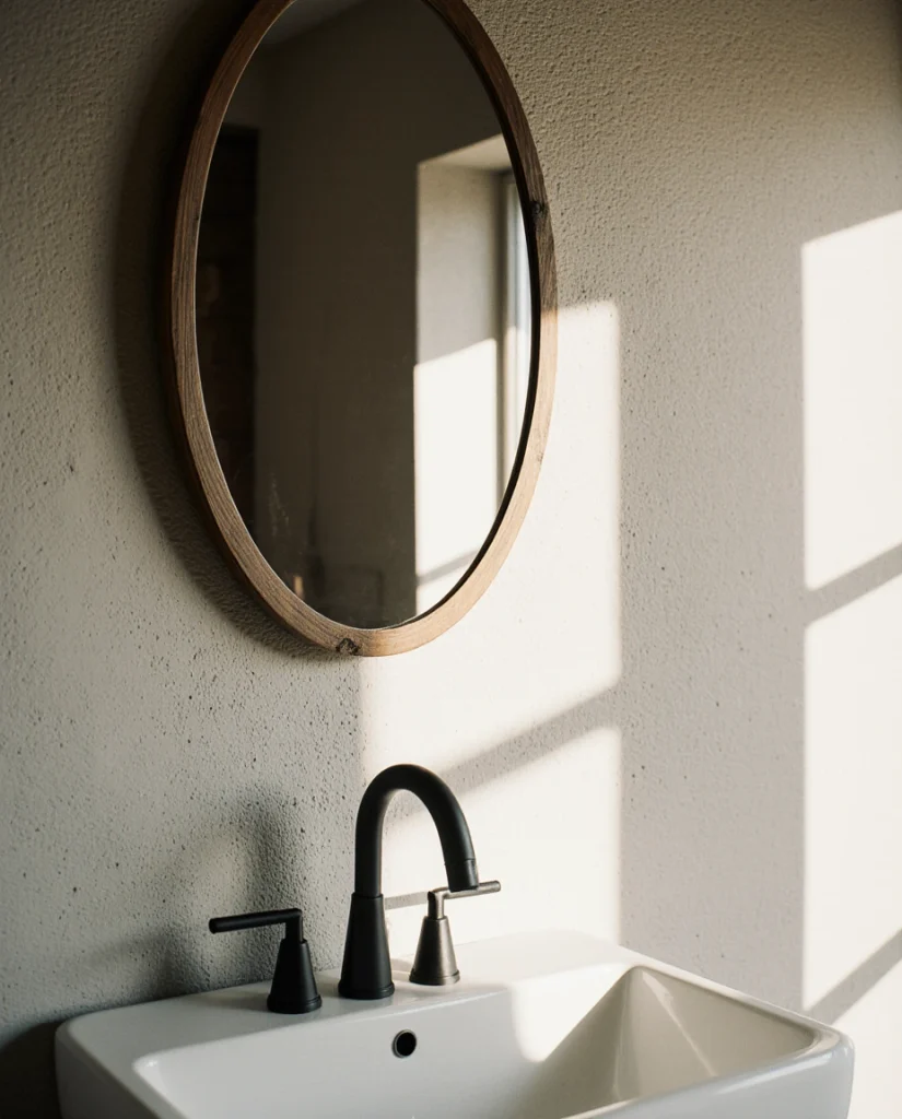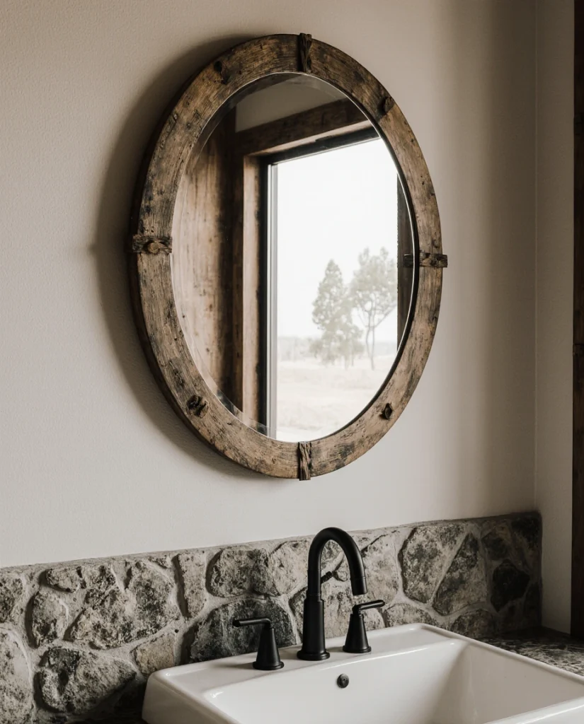A bathroom can adopt Western charm through simple country details such as matte black fixtures, wooden mirrors, and soft neutral tones. This idea suits homeowners who prefer understated decor rather than heavy themes. Light textures and small DIY touches add warmth without overwhelming the space.