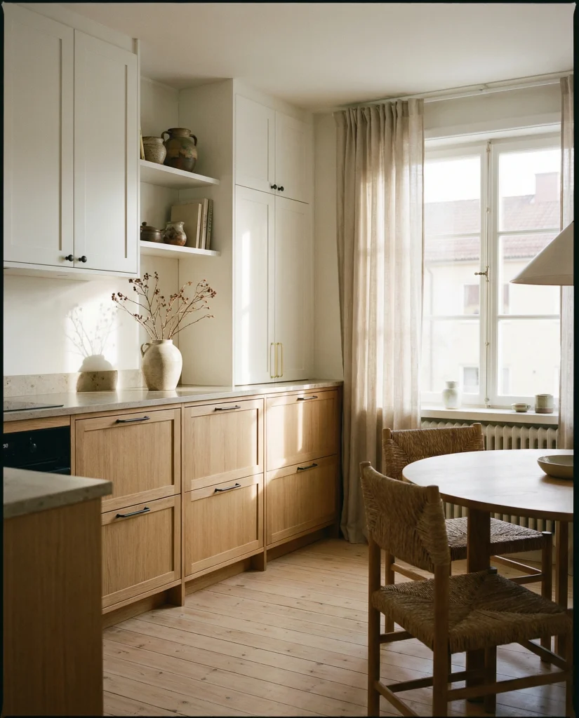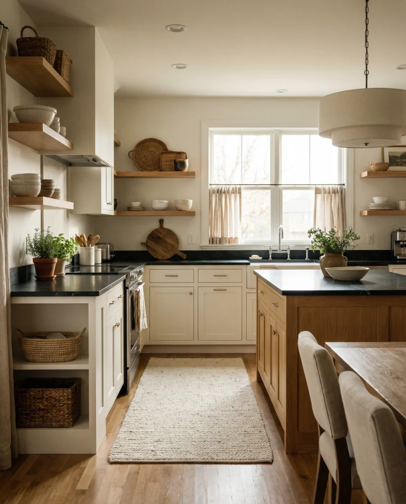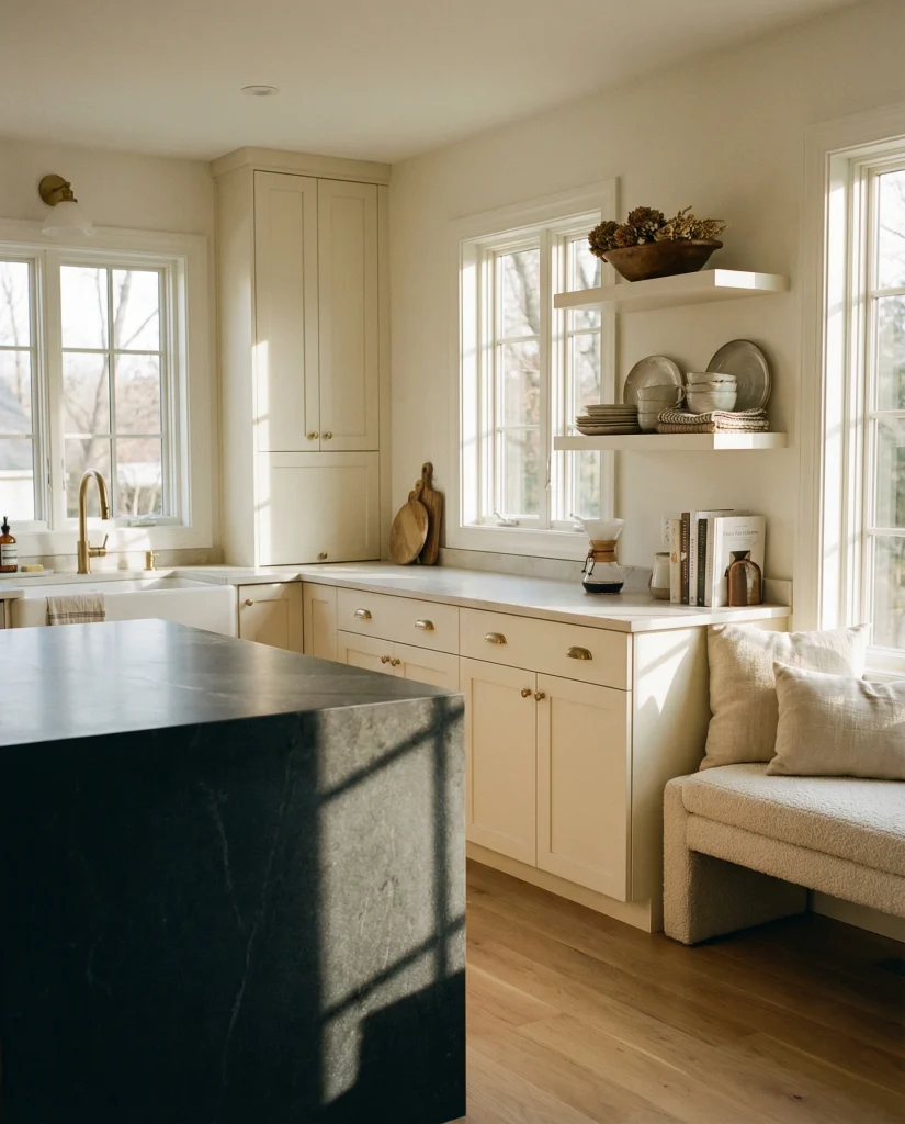 Creamy white cabinets lend depth to their light brightness, almost interacting with one another for a very clean look. This color goes beautifully with blue and soft gray accent colors and is perfect for softening kitchens that mercilessly feel too cool with off-white. A lot of designers mention that creamy whites counterbalance some bold features like black countertops or highly patterned tiles. Creamy cabinets have totally changed the vibe of a combo layout with an open kitchen and living room, especially with a wooden island or some organic decorating.