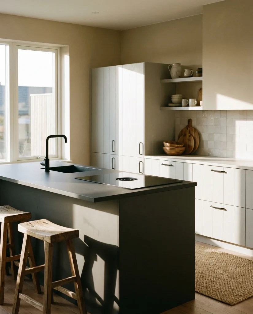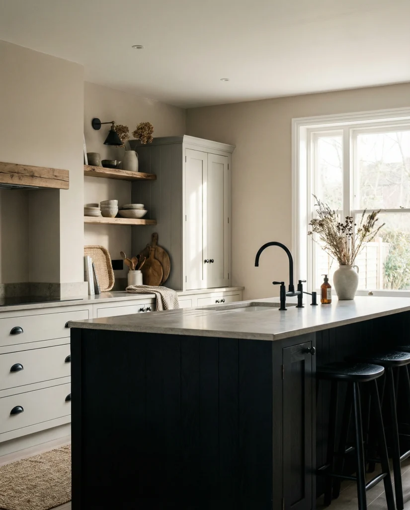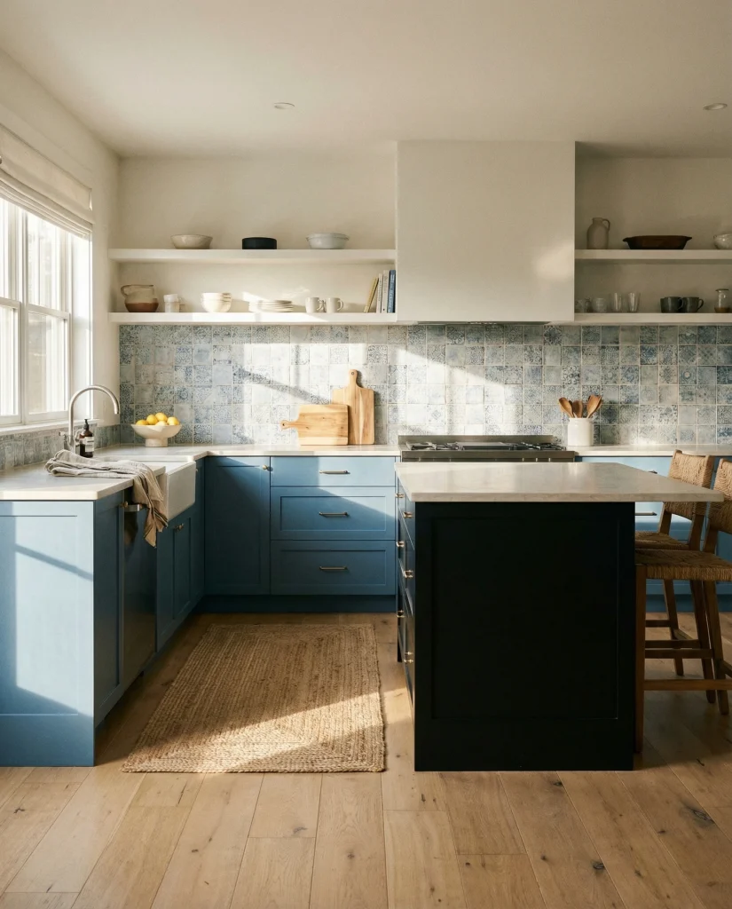 A white upper coupled with a bold black island truly rules the ideas for 2026. Grounding the space, it creates somewhat of a luxurious contrast that would work well in both modern and classic styled interiors. I’ve seen this design in a farmhouse-style home where the island became the star in an otherwise rather dull space.
