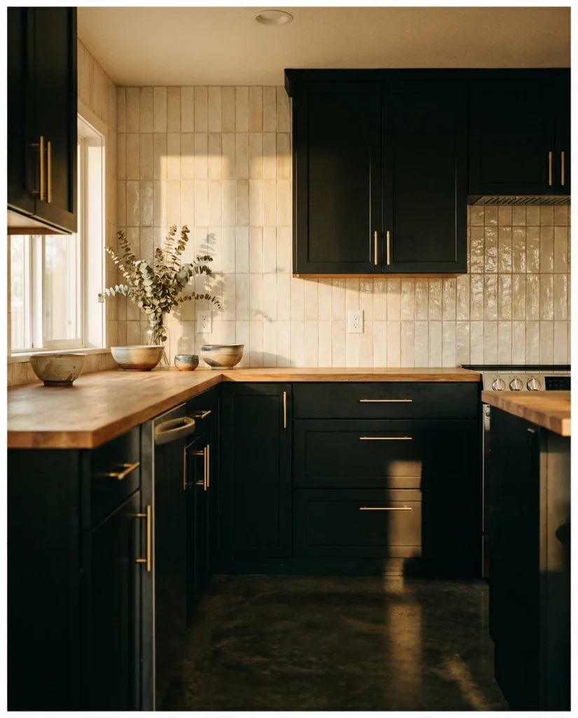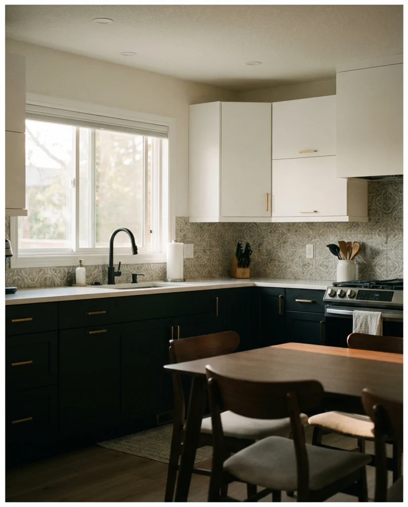 Black and white cabinet pairing is quite a statement, yet it makes a timeless kitchen style much in demand in many homeowners’ eyes. The white being pure keeps a room’s light articulated whereas black hardens and makes things a bit ‘modern.’ This juxtaposition works smartly with black and gold hardware and a bit of texture on the backsplash. I saw this palette in a city townhouse’s renovation, and its effect was almost unforgettable and impactful: sharp, unafraid, and glamorous yet not cold.