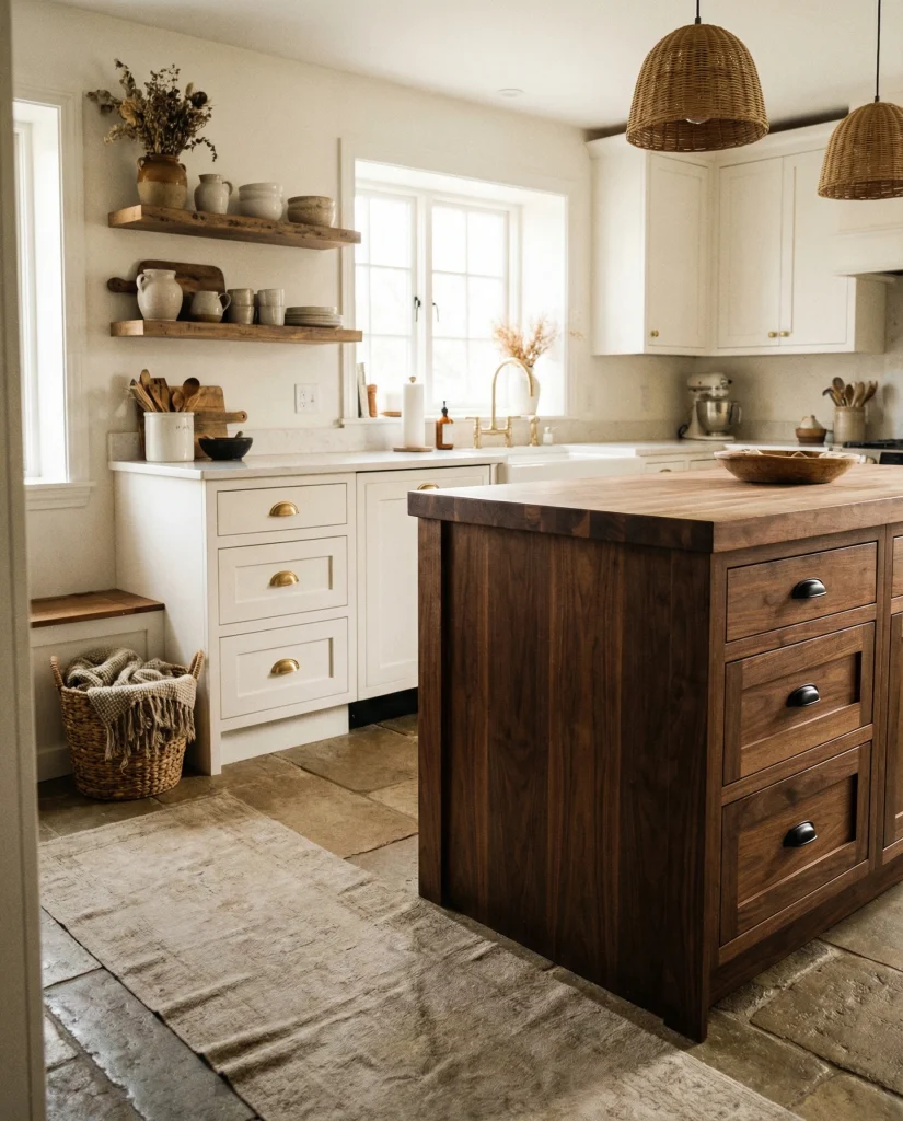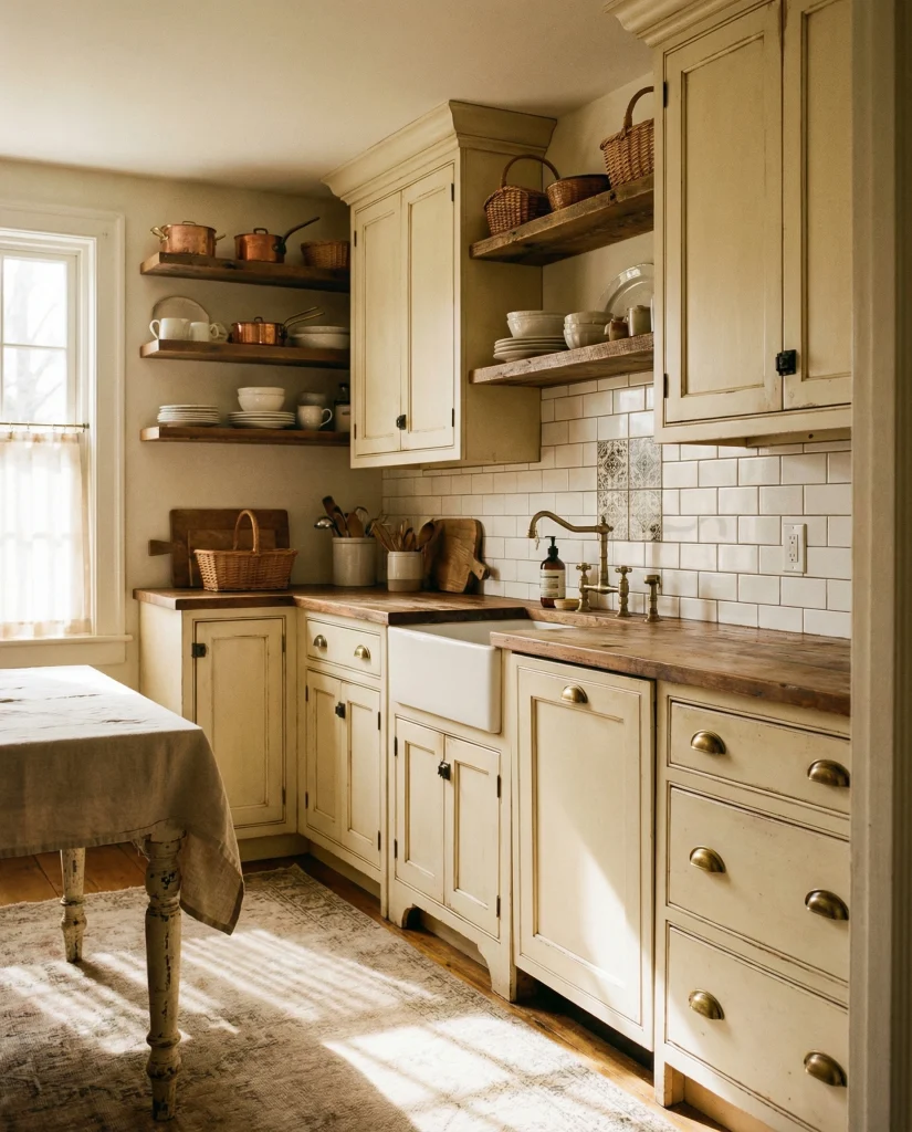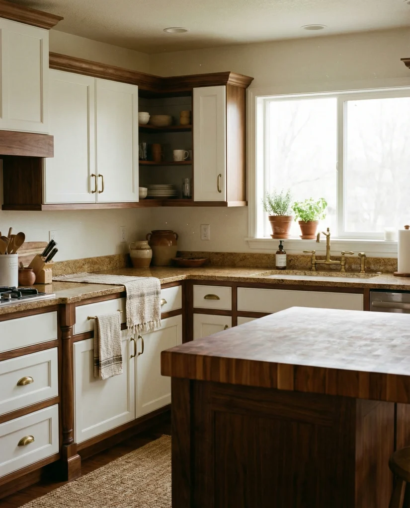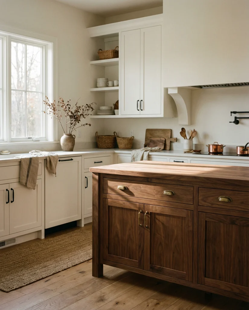 White Kitchen Cabinets 2026 with Creamy Antique Rustic Ideas and Modern Wood Island Design Trends