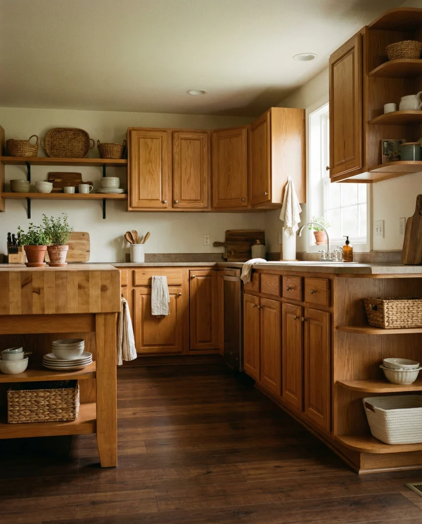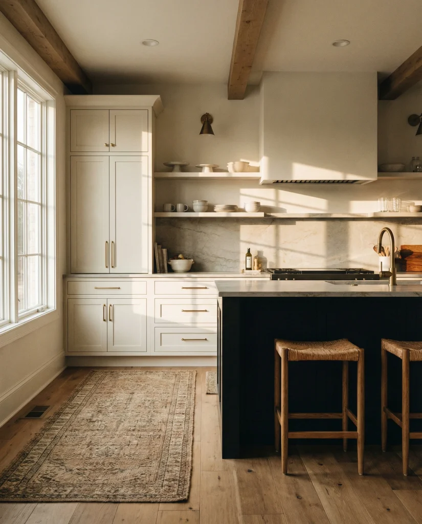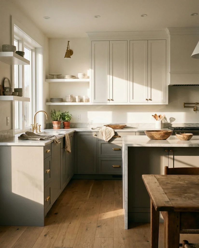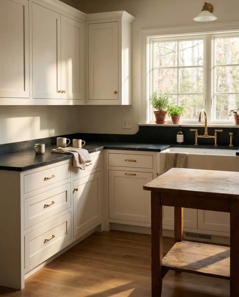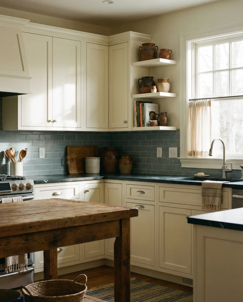 Antique white brings a warm vintage touch to the American heart, especially in older houses where character is everything. This comes together really well with black hardware, gold handles, and a superposed backsplash-like tile pattern picking up hints from traditional cottages. When I visited my friend in the 1920s bungalow, their antique cabinets managed to create a cozy gathering place. Combined with green and blue accents or light wood and open shelves, antique white is still a top choice for the kitchen winking with character.