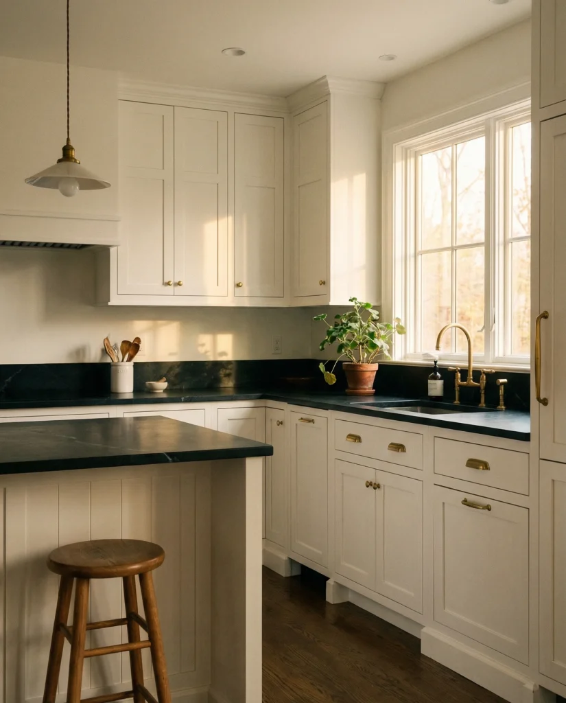 White cabinetry paired with black countertops is a welcomed high-contrast statement that increasingly ranks itself within refined gentility. It looks great in modern, transitional, and even rustic homes. I helped a couple select black quartz, and it was an instant upgrade in their kitchen design.