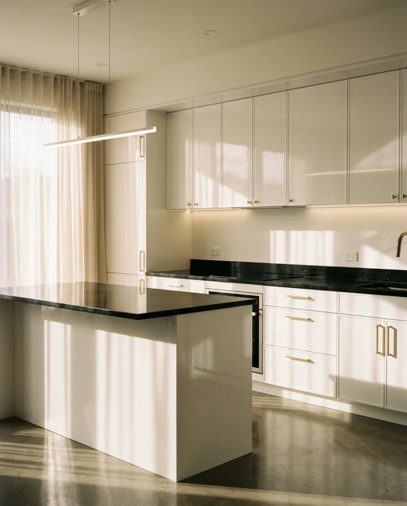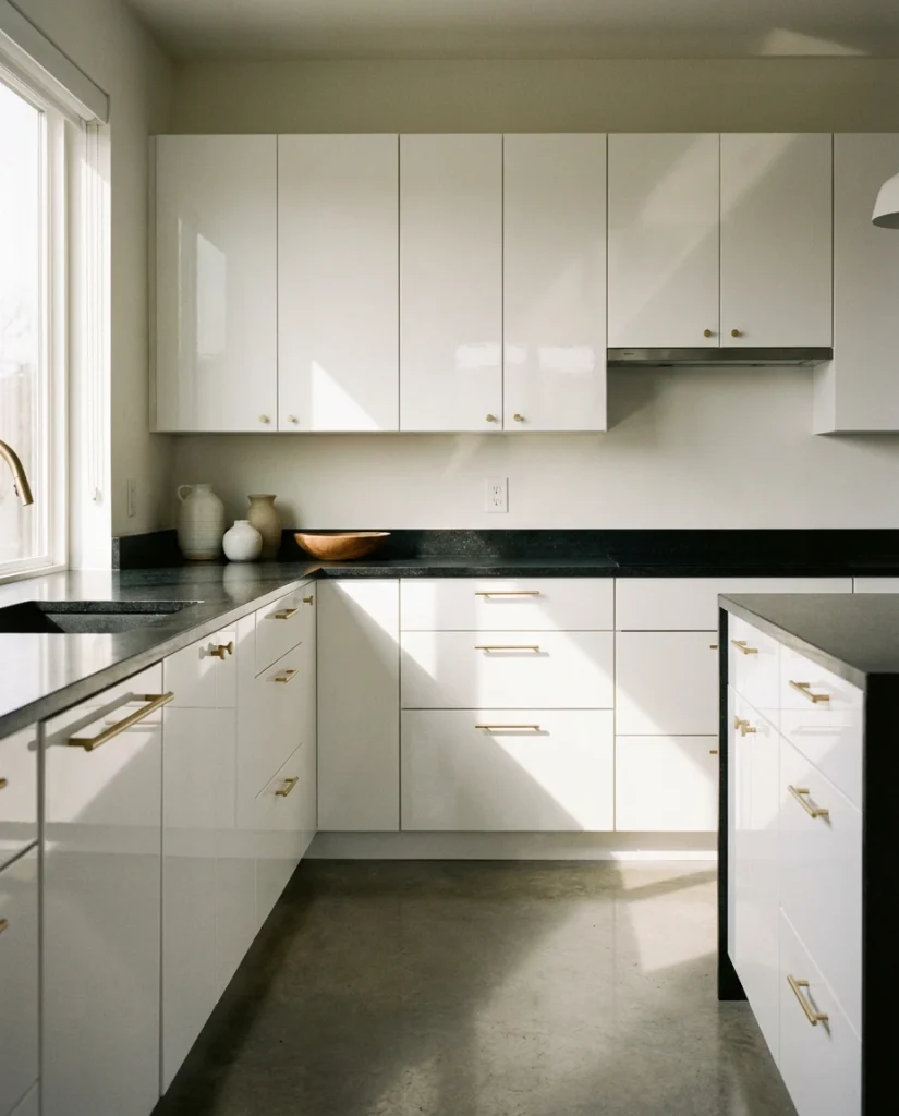 White glossy cabinets impress a touch of current taste into the life of the owners who wish for an update in their space. The shiny doors do well with black countertops, gold door handles, and a simplistic-looking backsplash. A well-polished floor gives a room vibrancy!. A loft renovation I toured embraced the white gloss so it seemed to coach the light thrown in through a skylight into something bright by reflecting back on itself; it almost always grows so shiny because it cleans easily, something busy families appreciate. [Lars Lind]: As another example, San Diego crafted gloss cabinets for their clients’ spaces—the beautification of the wood was just jaw-dropping!.