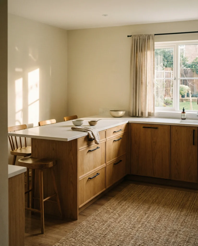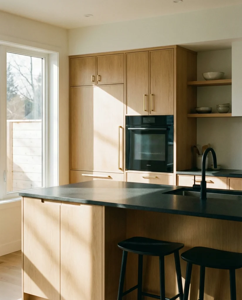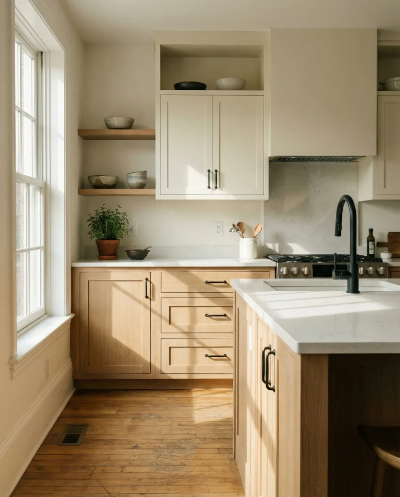 For smaller spaces, a peninsula instead of an island highlights white oak beautifully while improving workflow. Many homeowners choose this option in older homes where expanding isn’t feasible. Soft finish options, black hardware, and modest backsplash ideas keep the look crisp. It’s practical yet design-focused, ideal for everyday cooking habits.