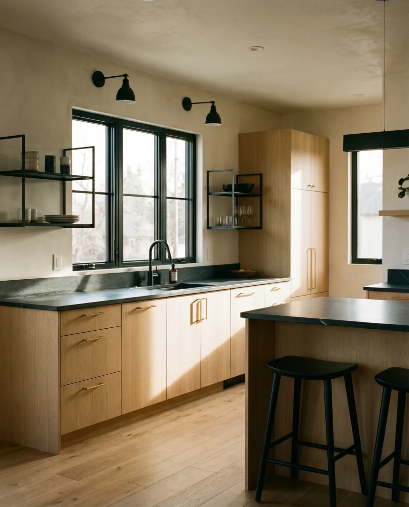 Combining white oak cabinetry and open shelves for a match creates a breathable, articulate look. While preserving an easygoing look, many designers would suggest propping up ceramics, glassware, or cookbooks for a modern designed effect that does not overpower the space. Maintaining a continuum in wood tones, the kitchen speaks well together, working best with the gold hardware or black hardware [depending on taste].