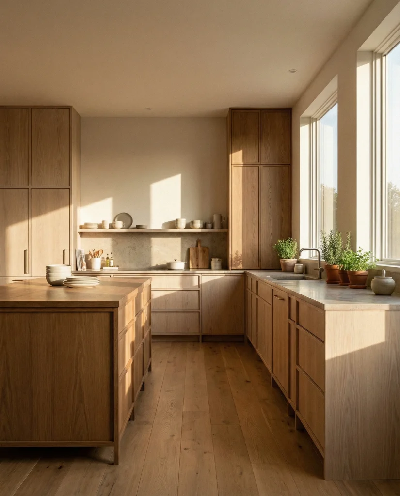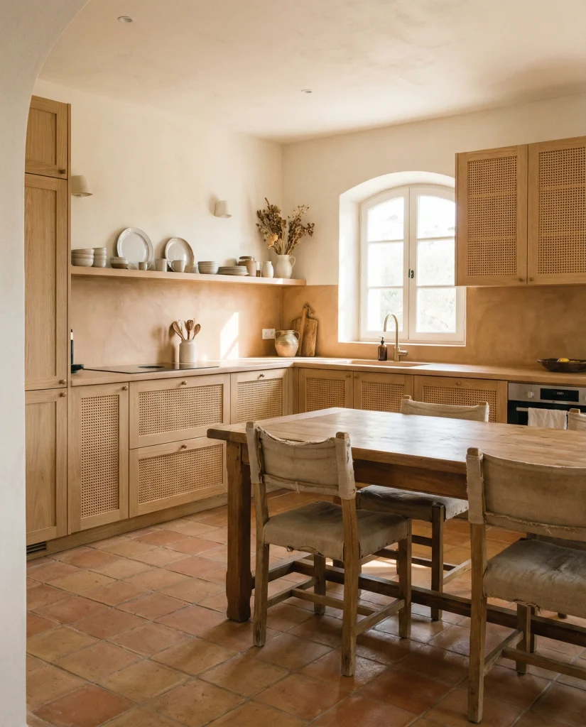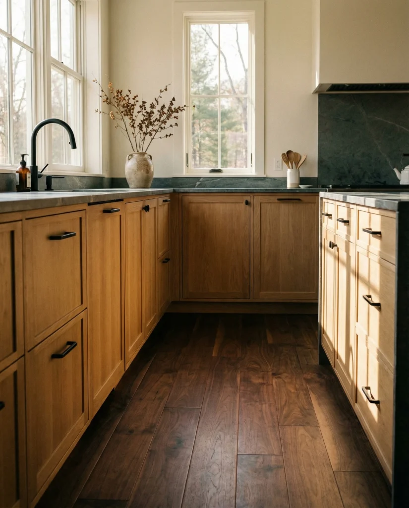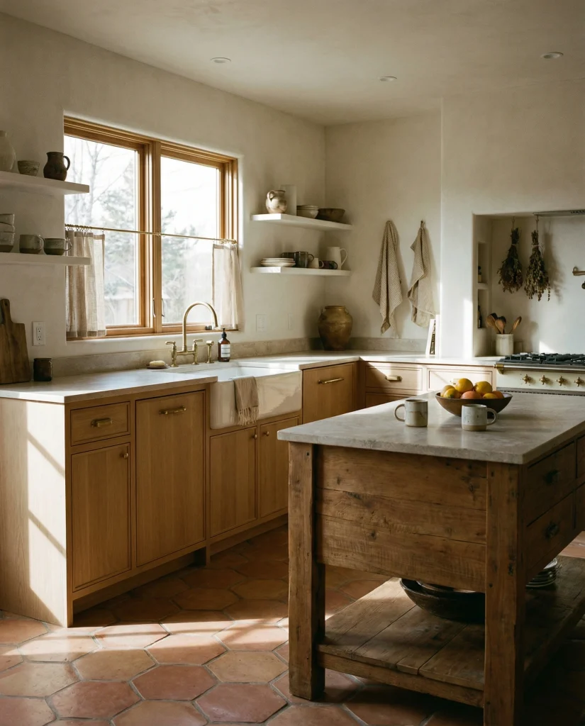 European-flavored kitchens love white oak washed with somewhat gentle colors of stain, aged brass, and stone. This “aged” feel seems relaxed yet upscale, particularly with dark-wood planks or terracotta-like floors. Many are echoing the sentiment that this one is fit for those who want a “collected” kitchen more than a “new” kitchen.