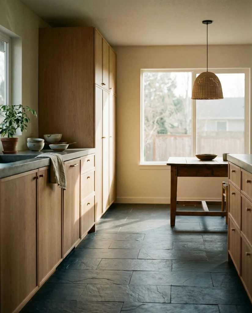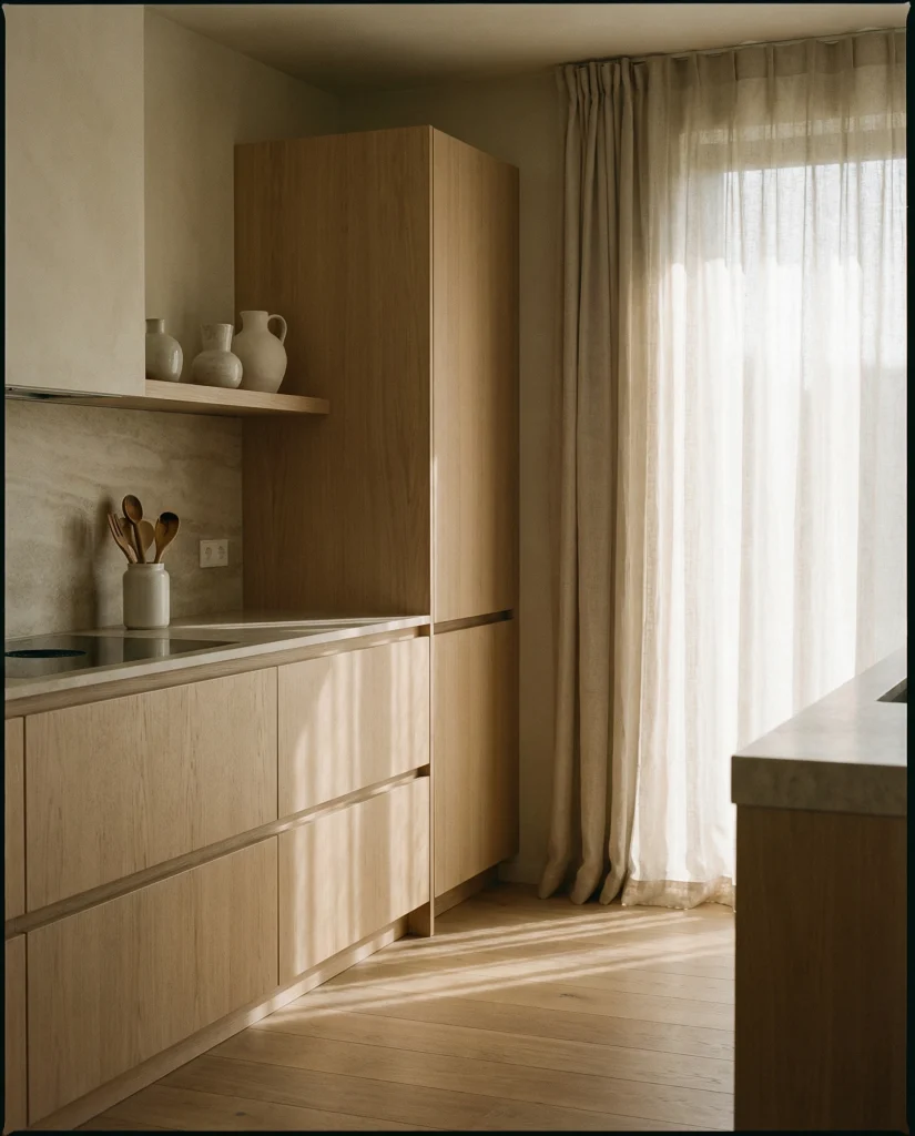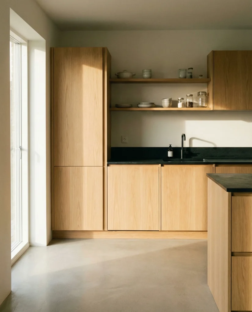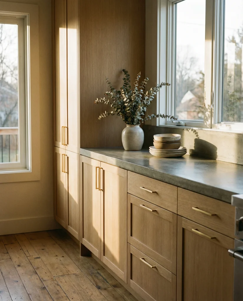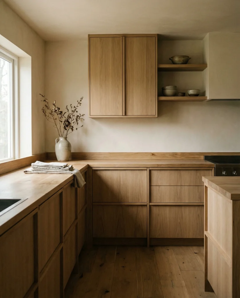 European-flavored kitchens love white oak washed with somewhat gentle colors of stain, aged brass, and stone. This “aged” feel seems relaxed yet upscale, particularly with dark-wood planks or terracotta-like floors. Many are echoing the sentiment that this one is fit for those who want a “collected” kitchen more than a “new” kitchen.