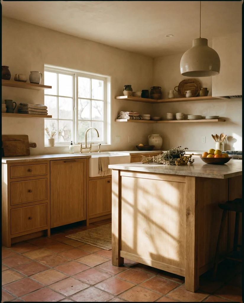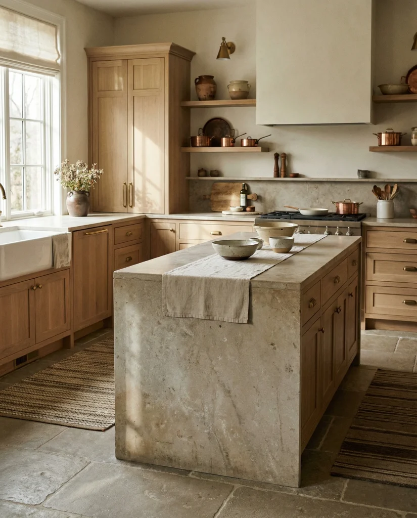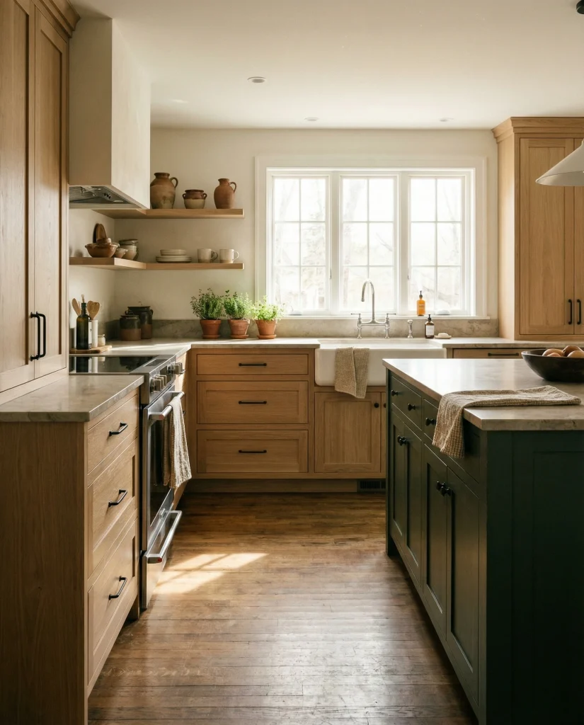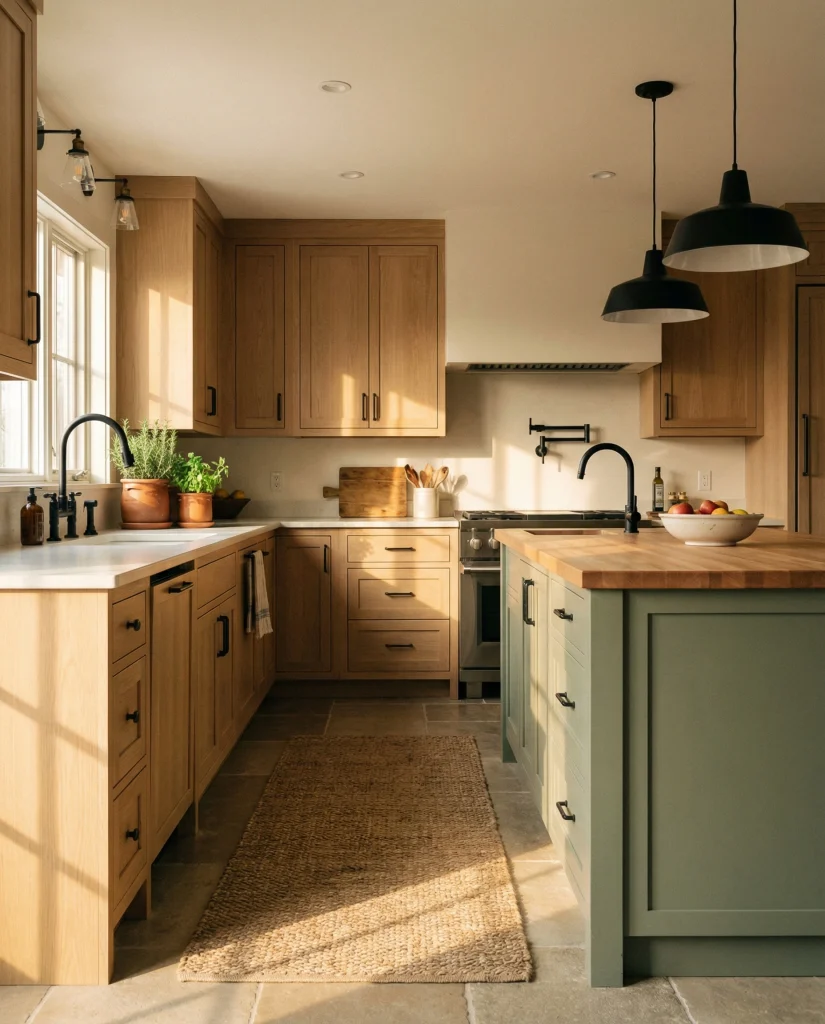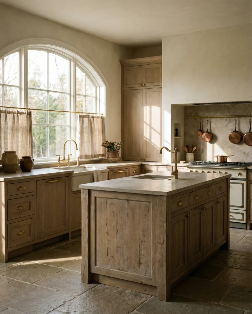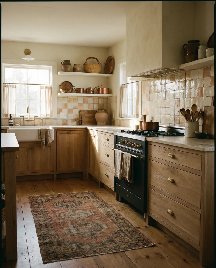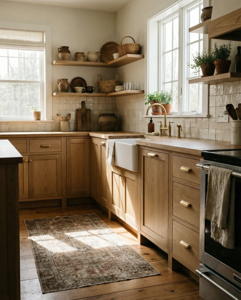 A rustic or farmhouse-influenced kitchen is gorgeously inviting when warmed up with natural white oak cabinets, plush textiles, and metallic accents in warm tones. Show some vintage rugs, open shelving, and subtle ideas, such as aged brass. Friends often comment on the fact this style initially feels lived-in, especially for families enjoying the cozy gathering space.