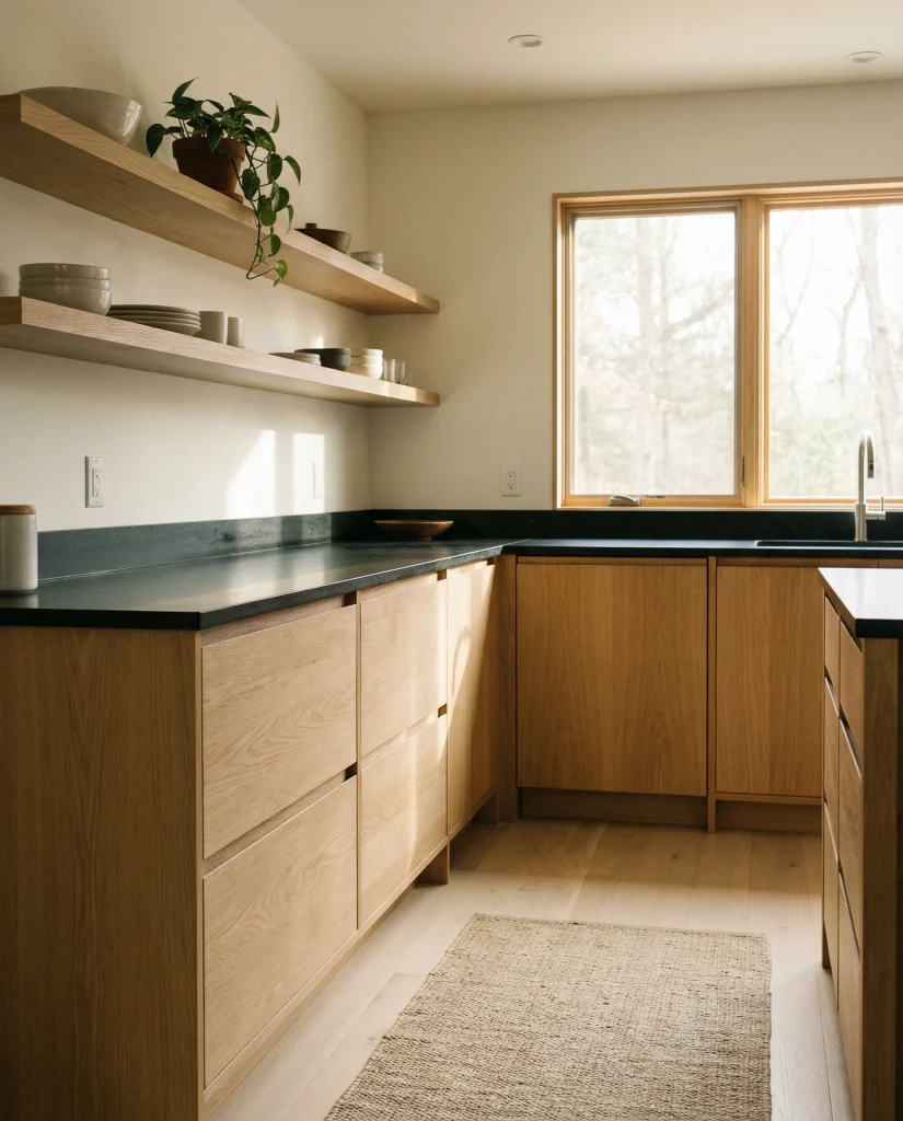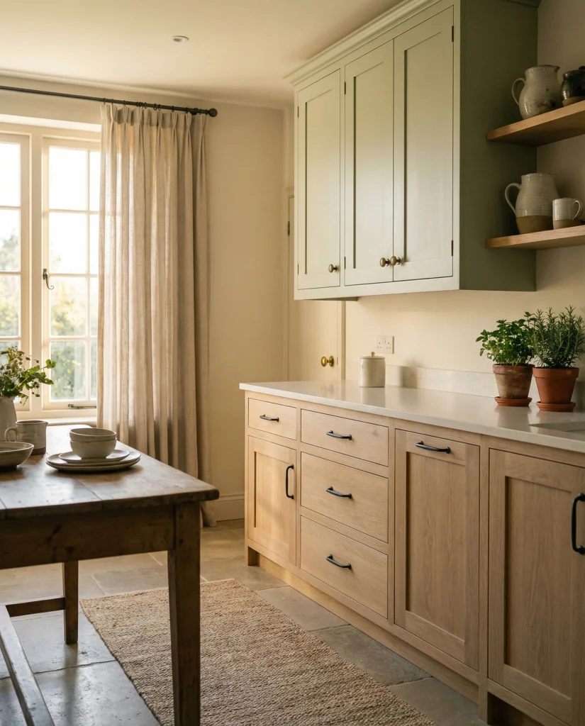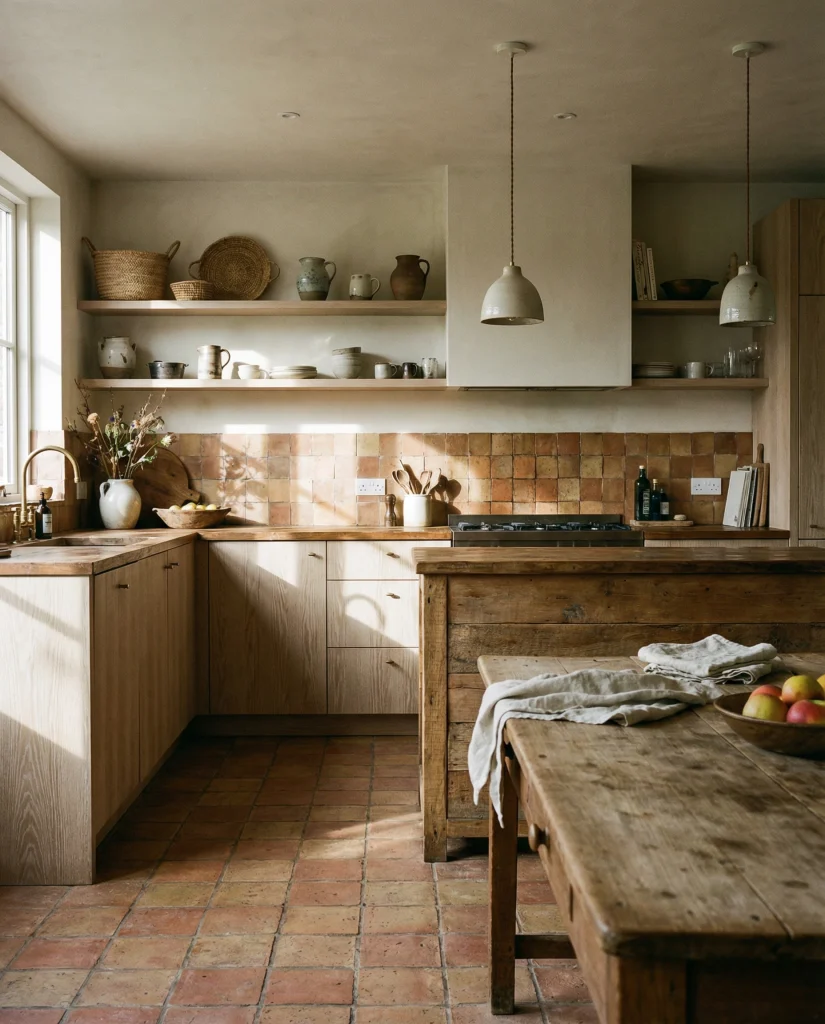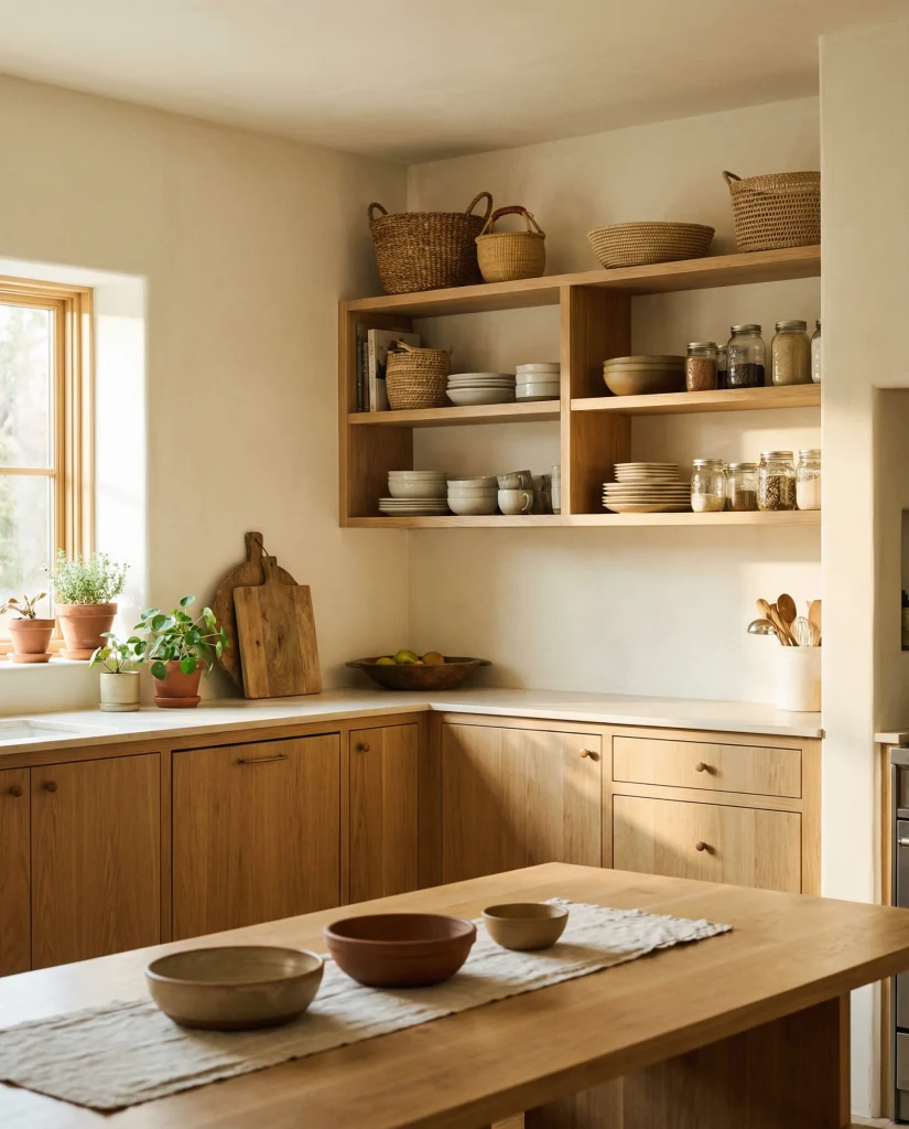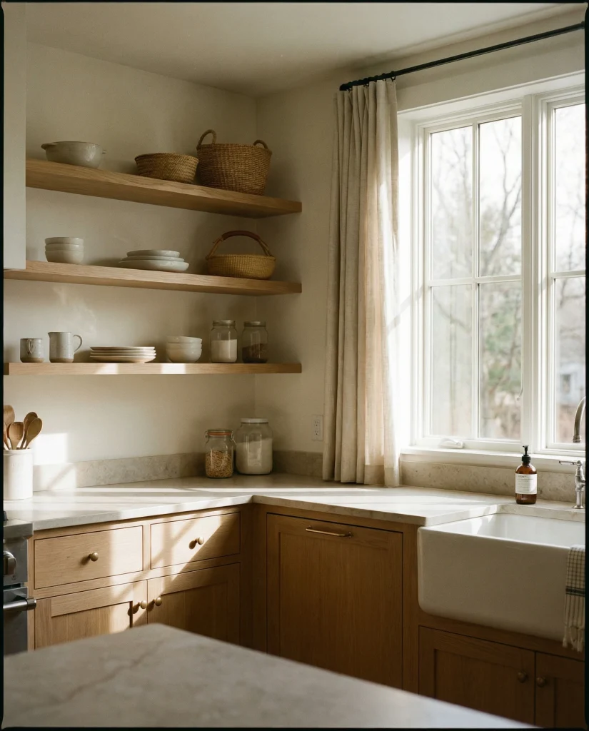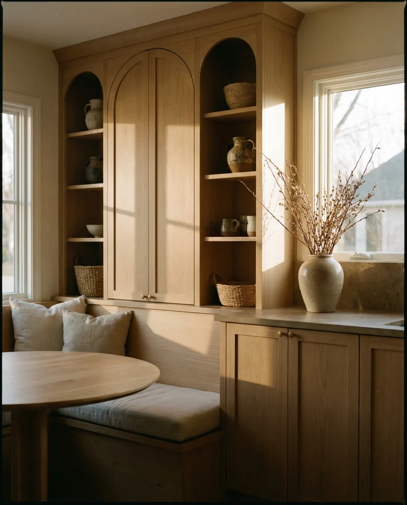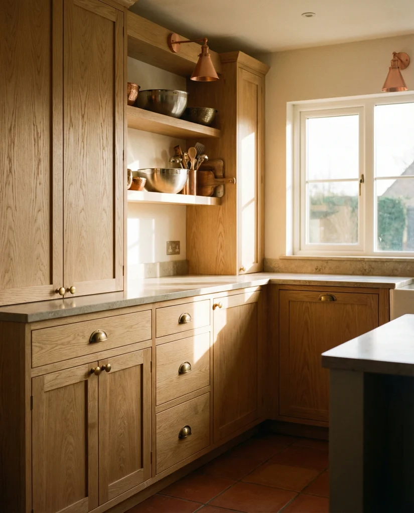A rustic or farmhouse-influenced kitchen is gorgeously inviting when warmed up with natural white oak cabinets, plush textiles, and metallic accents in warm tones. Show some vintage rugs, open shelving, and subtle ideas, such as aged brass. Friends often comment on the fact this style initially feels lived-in, especially for families enjoying the cozy gathering space.