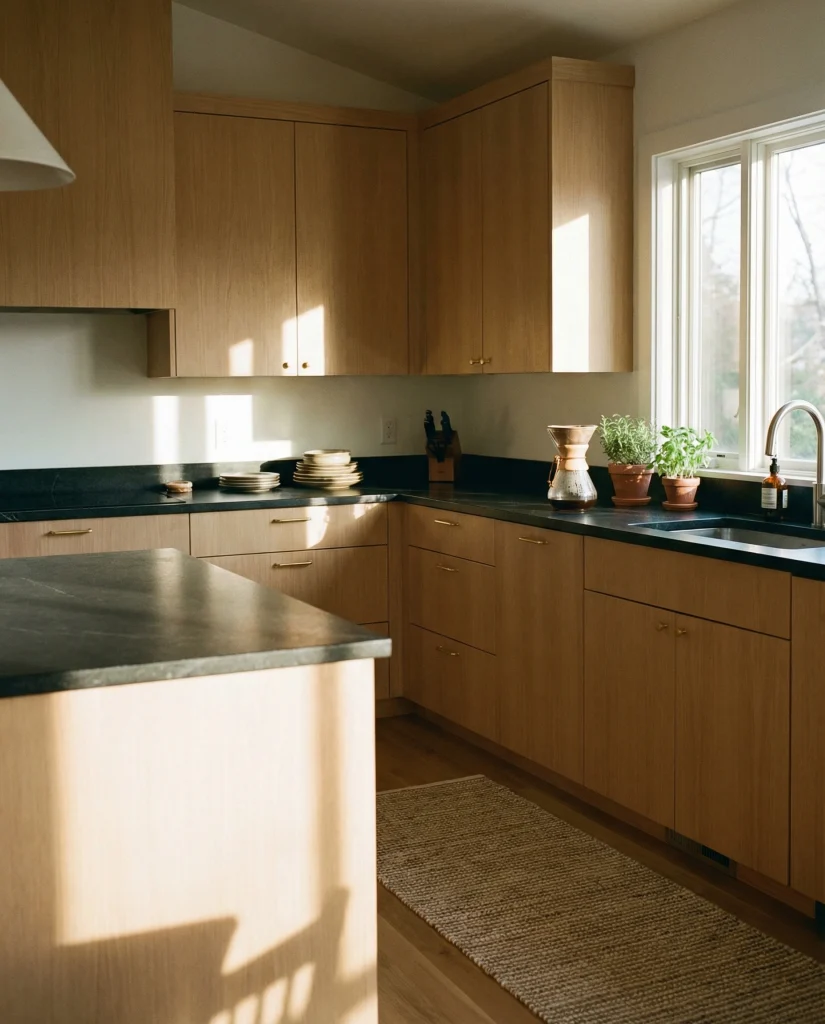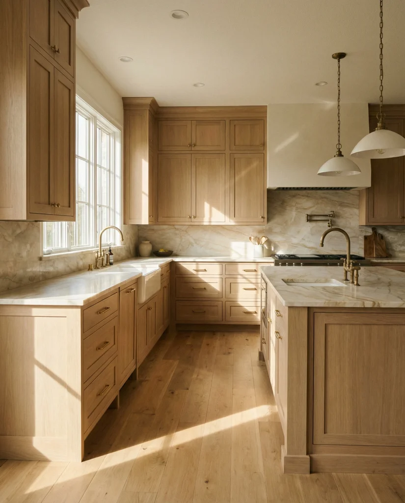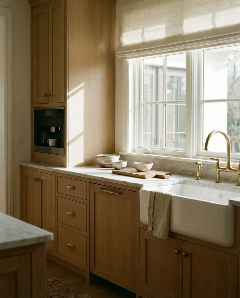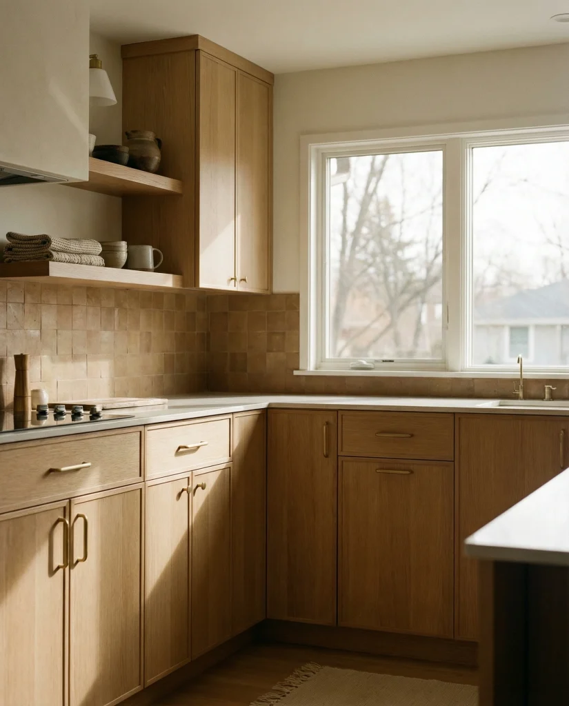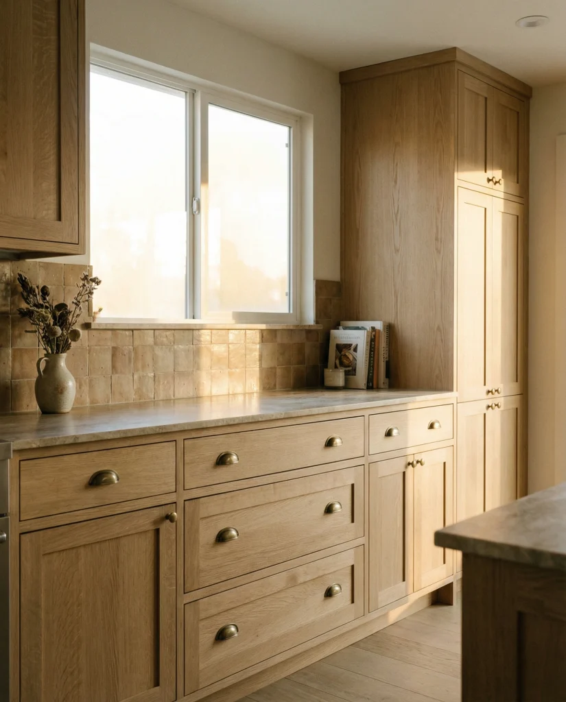 Quarter-sawn white oak has tight, linear graining that looks refined and even architectural. Its gentle, natural tone harmonizes beautifully with brass hardware and more subtle backsplash ideas, such as warm white zellige tile. Homeowners frequently choose this style when they want bespoke cabinets with a relaxed feeling, especially in homes with dark wood floors.